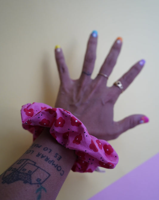 Coletero rosa con flores rojas