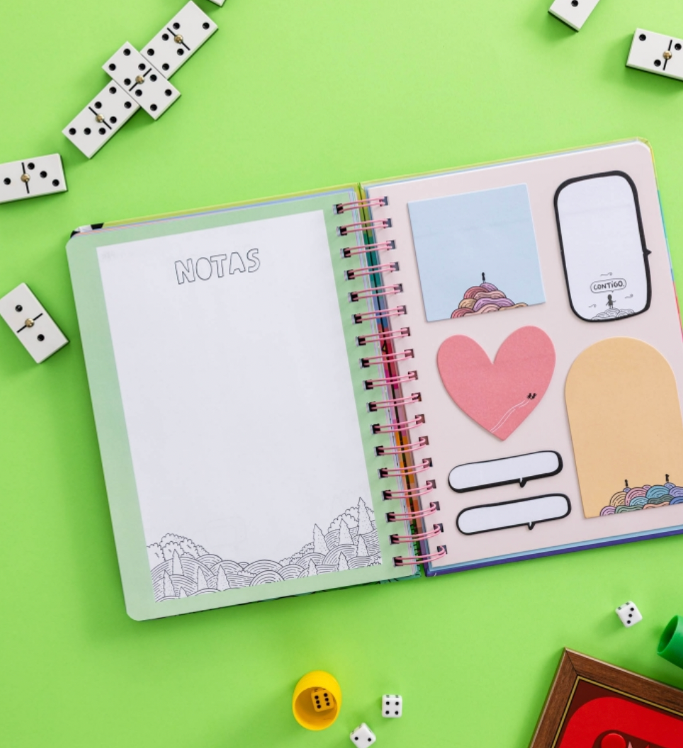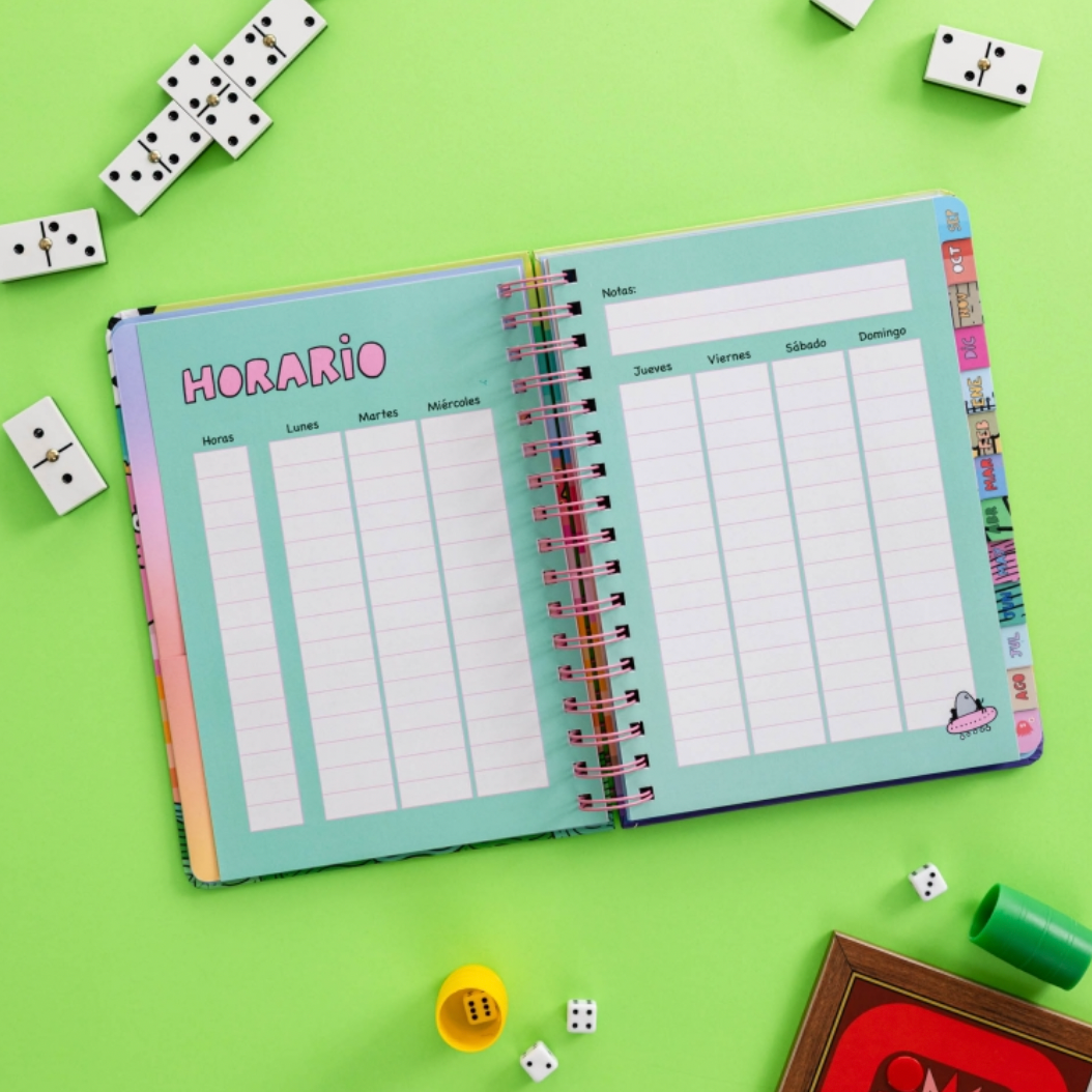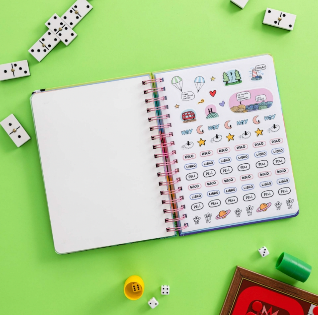 Viene con pegatinas, con organizador de tareas, con ilustraciones y post its que son TAN GUAAAYS.