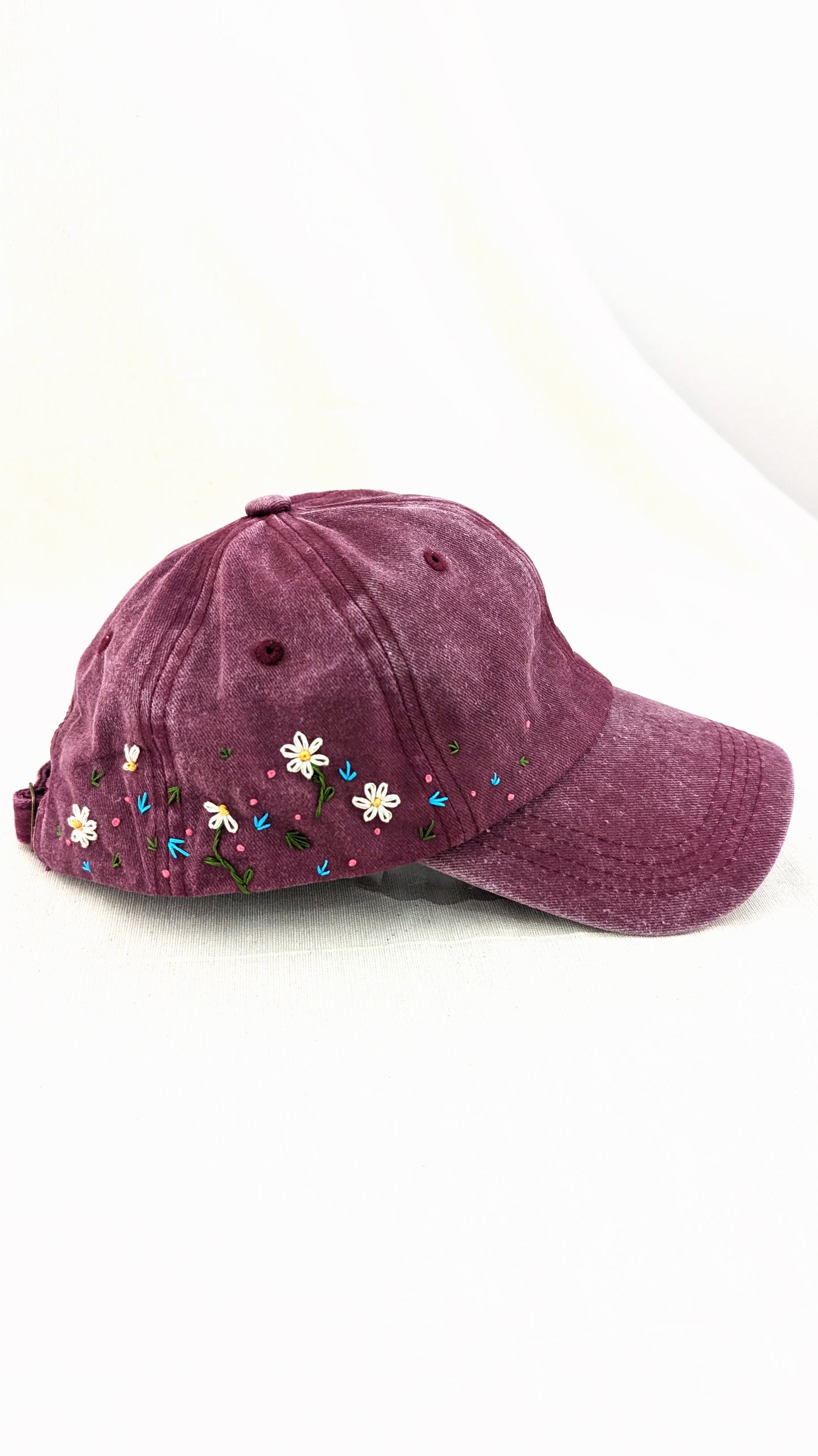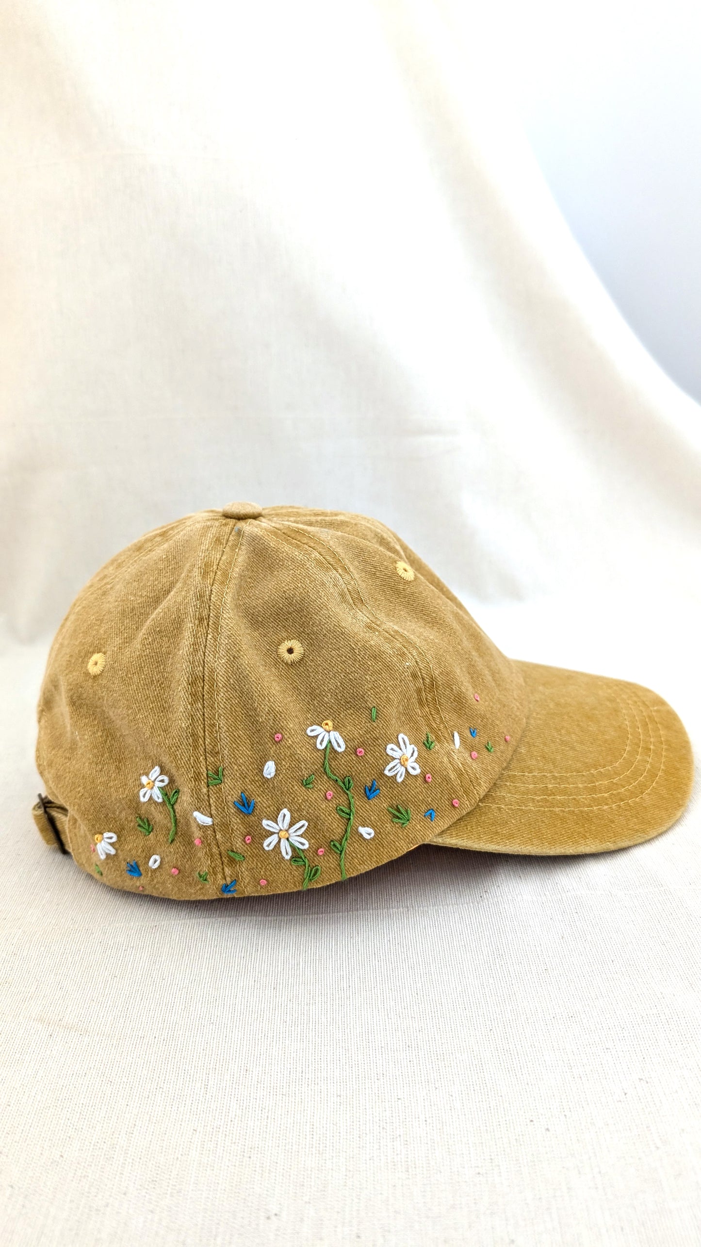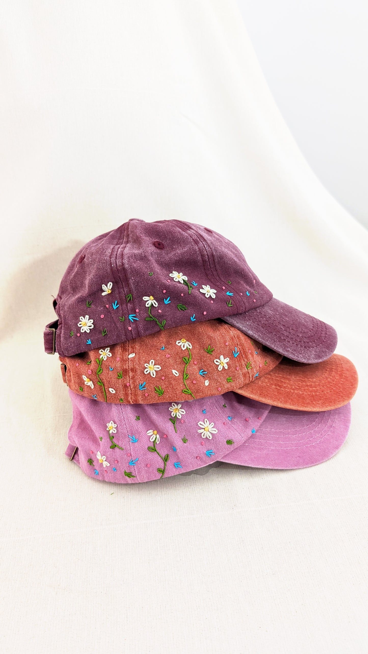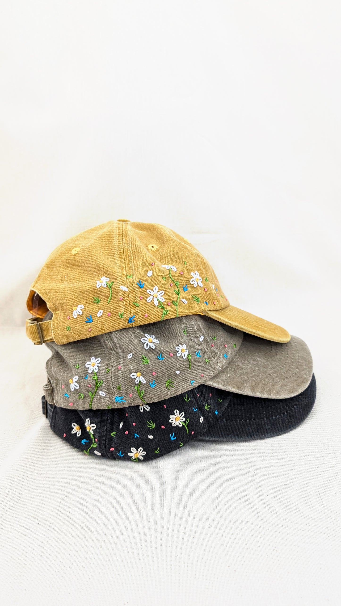 Estas gorras están bordadas a mano alrededor de margaritas y sol.