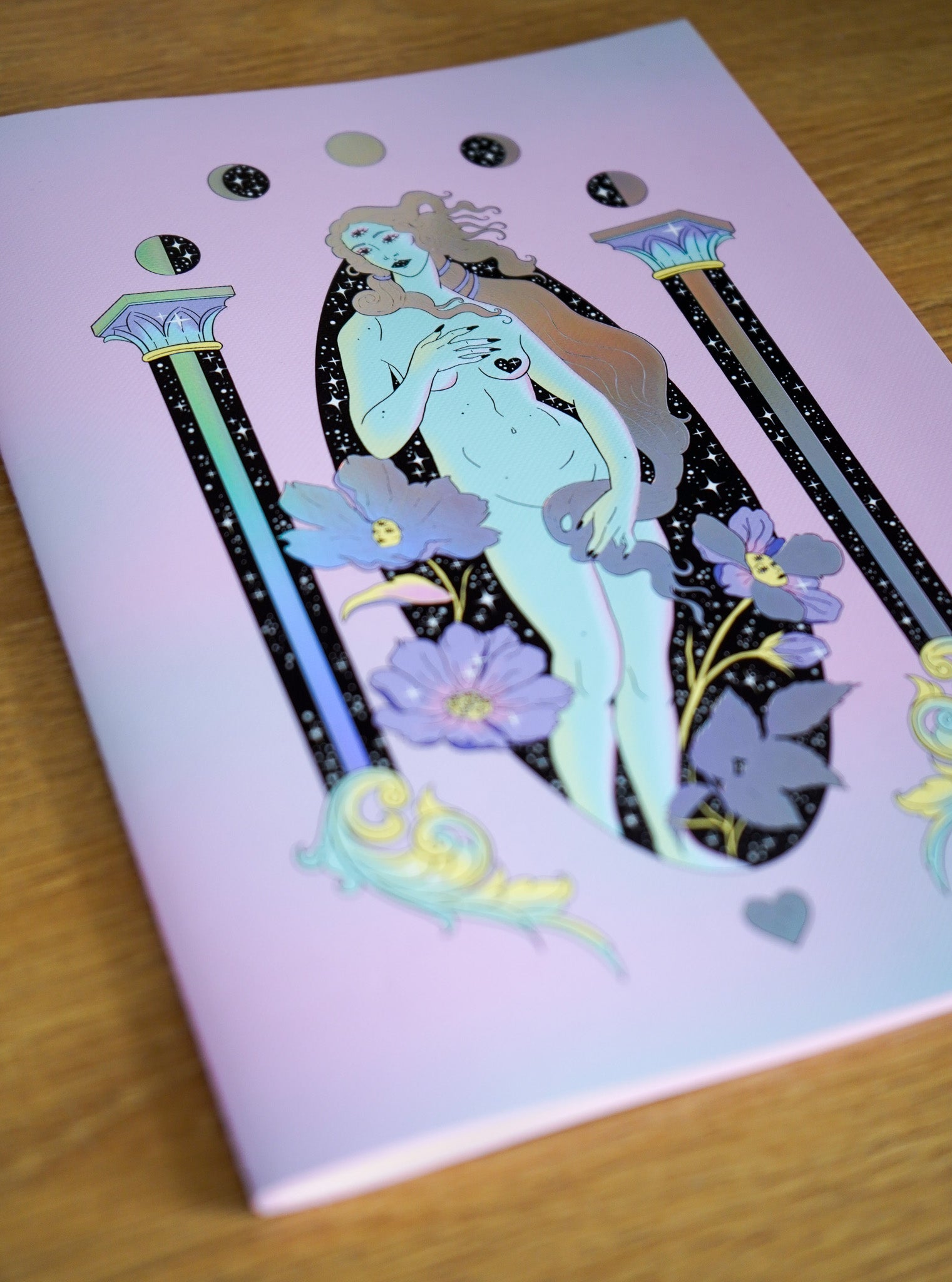 Libreta de la Venus de Isa Muguruza con cubierta de textura similar a tejido y acabados iridiscentes to brilli brilli.