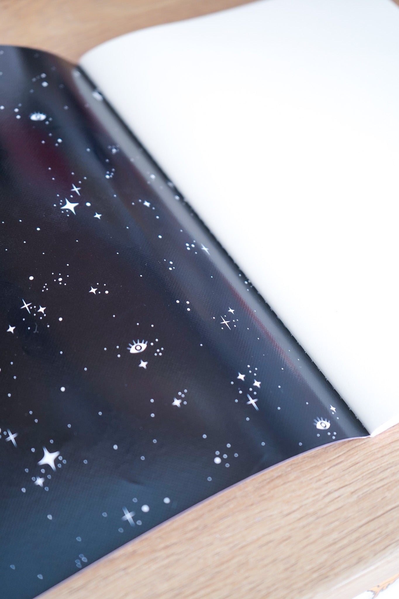 Por dentro hojas lisas de tono ocre y con el espacio sideral en el interior de las portadas.