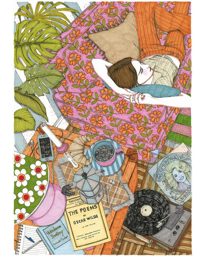 Sitting on the edge of the bathtub next to her cat while she paints her nails, she also spends time writing down her thoughts and little things that shape her life.