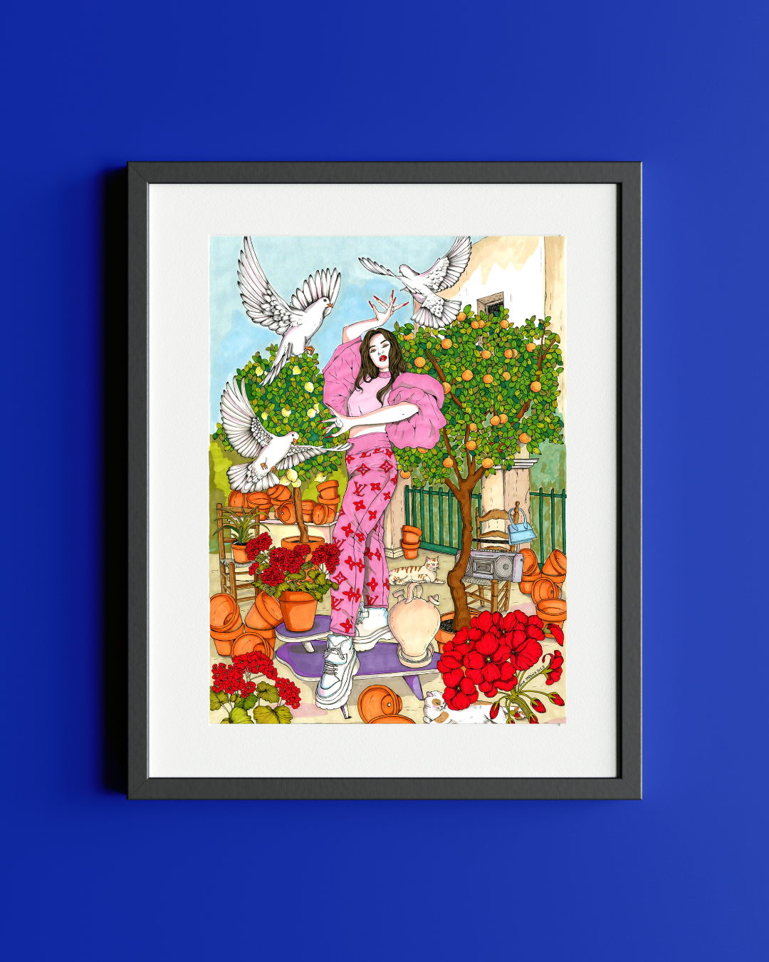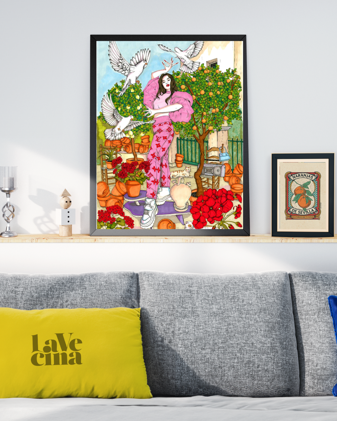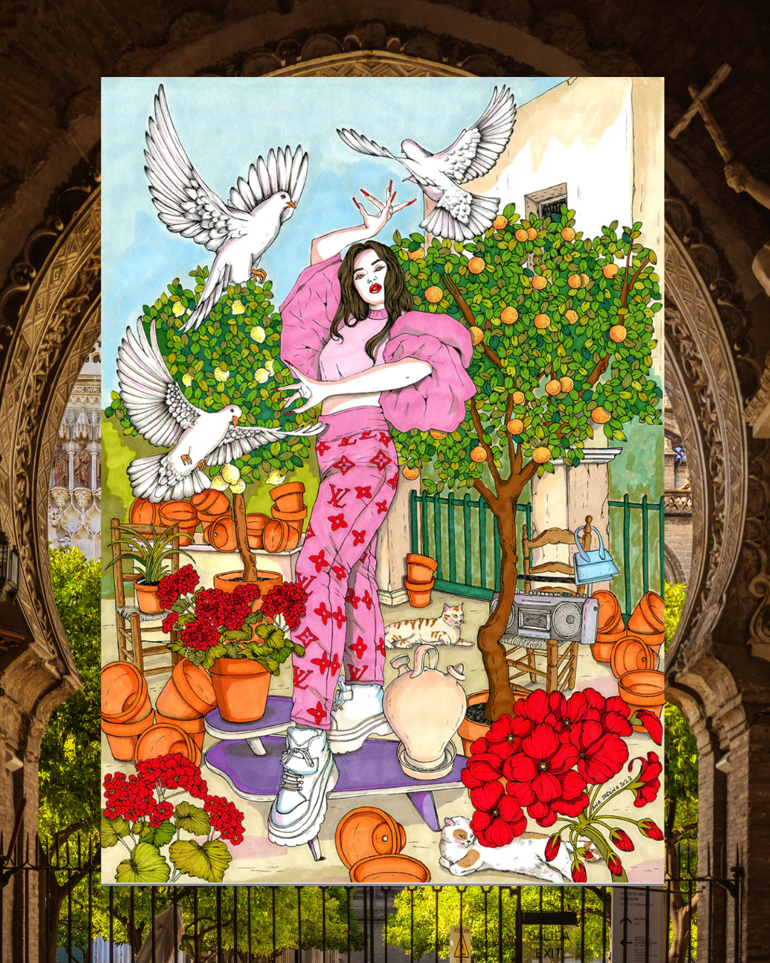 The fusion of talent and tradition in this unique art, with Rosalía immersed in the spell of tra tra, but with a Sevillian twist where doves flutter and oranges add their fresh touch.