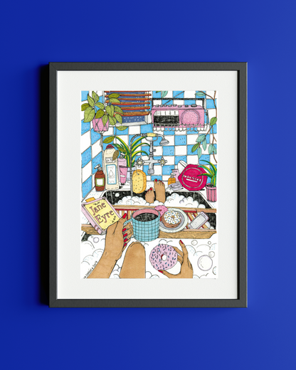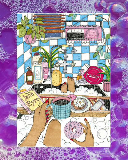 Life and tranquility mix in a chill scene where a girl enjoys a carefree breakfast in her bathtub, with a book and a donut, what more do you want?