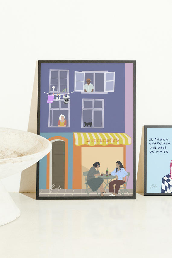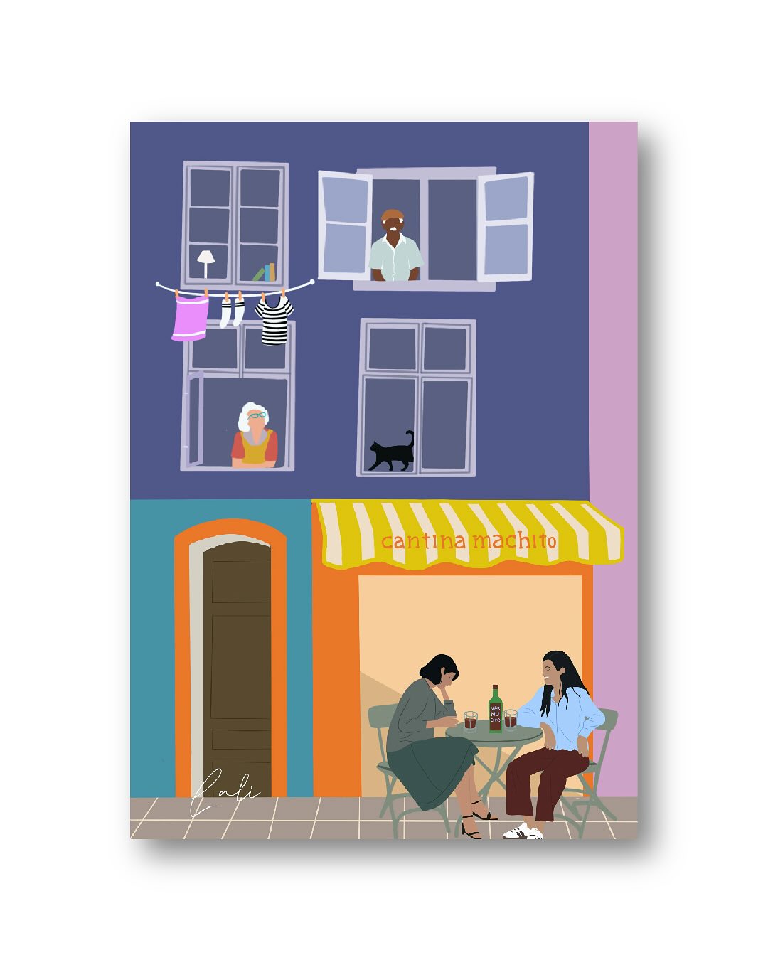Inspirada en el barrio de Gracia de Barcelona, esta lámina te inspira a parar, a observar a tus vecinas, a tomarte un cafelito y a dejarte llevar por la vida de barrio con tus amigas siempre.