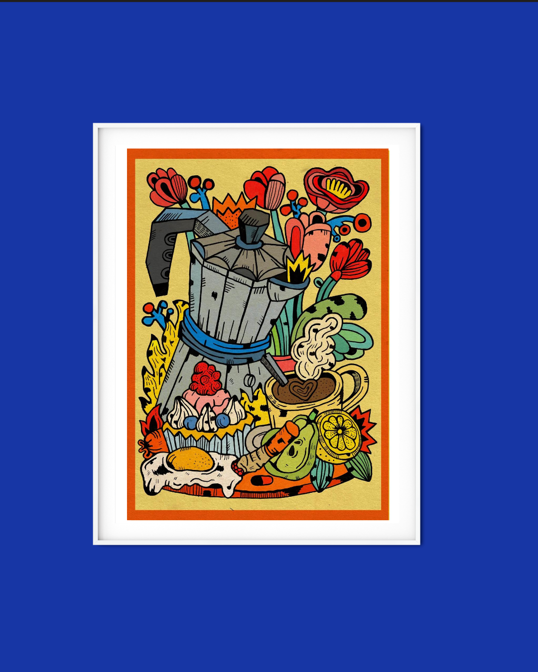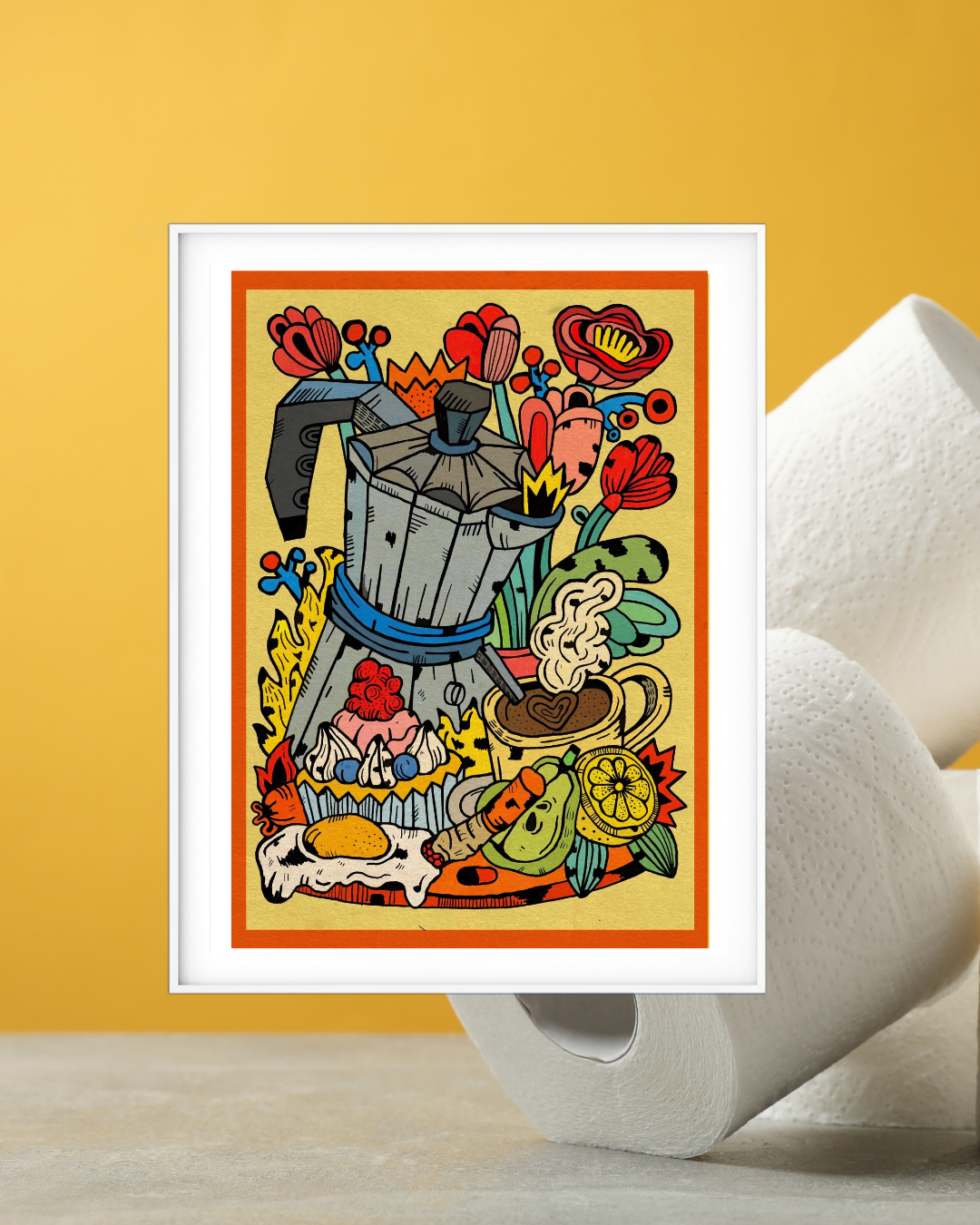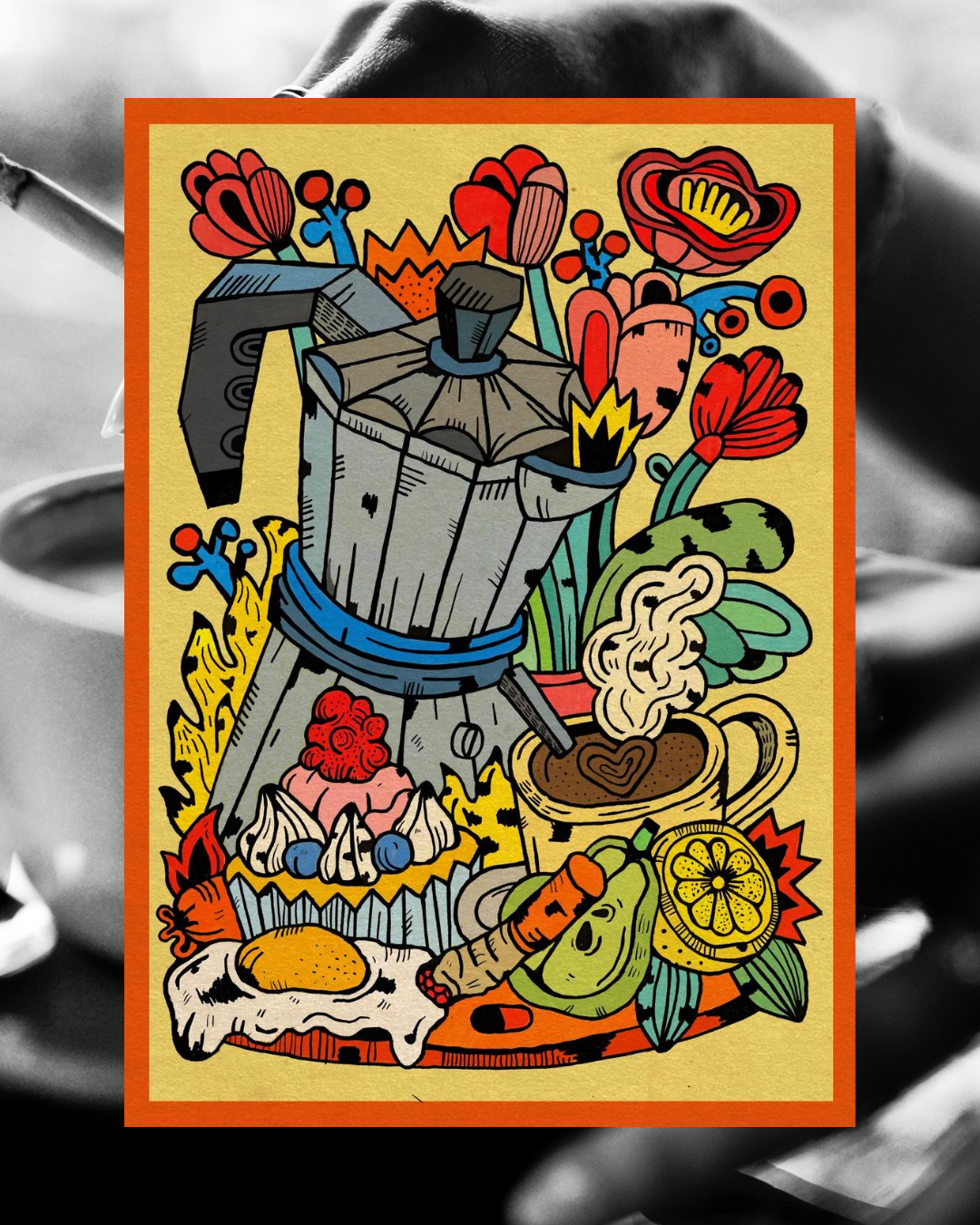 This print captures the essence of a daily ritual: coffee, the cigarette and that peculiar clay doll that seems to have its own story.