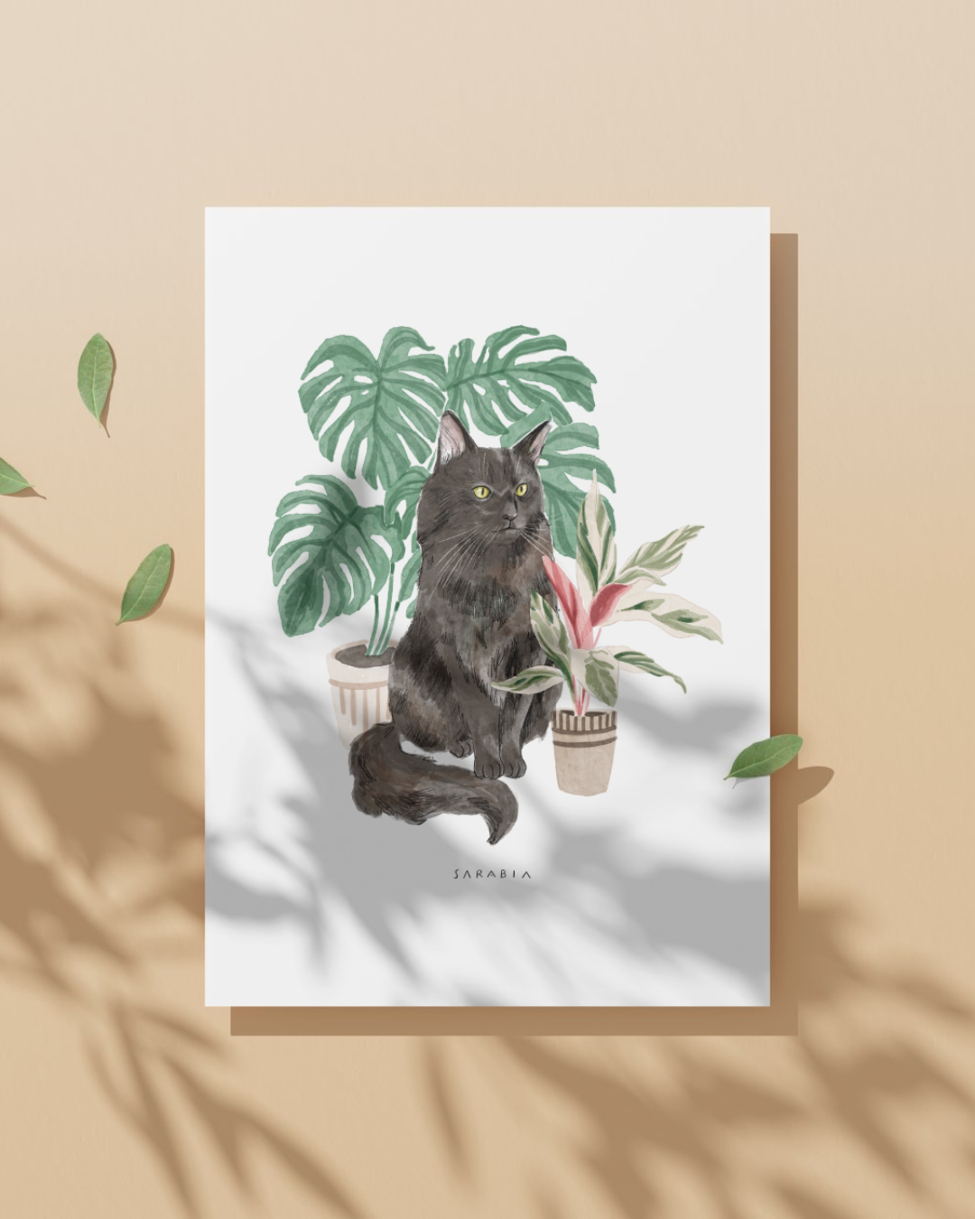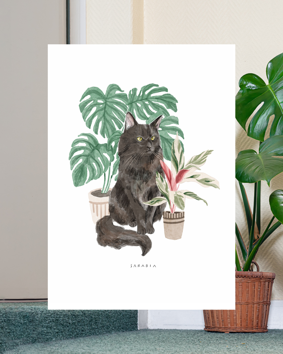 Lámina Gato negro peludo con planta monstera