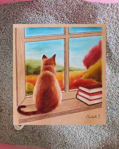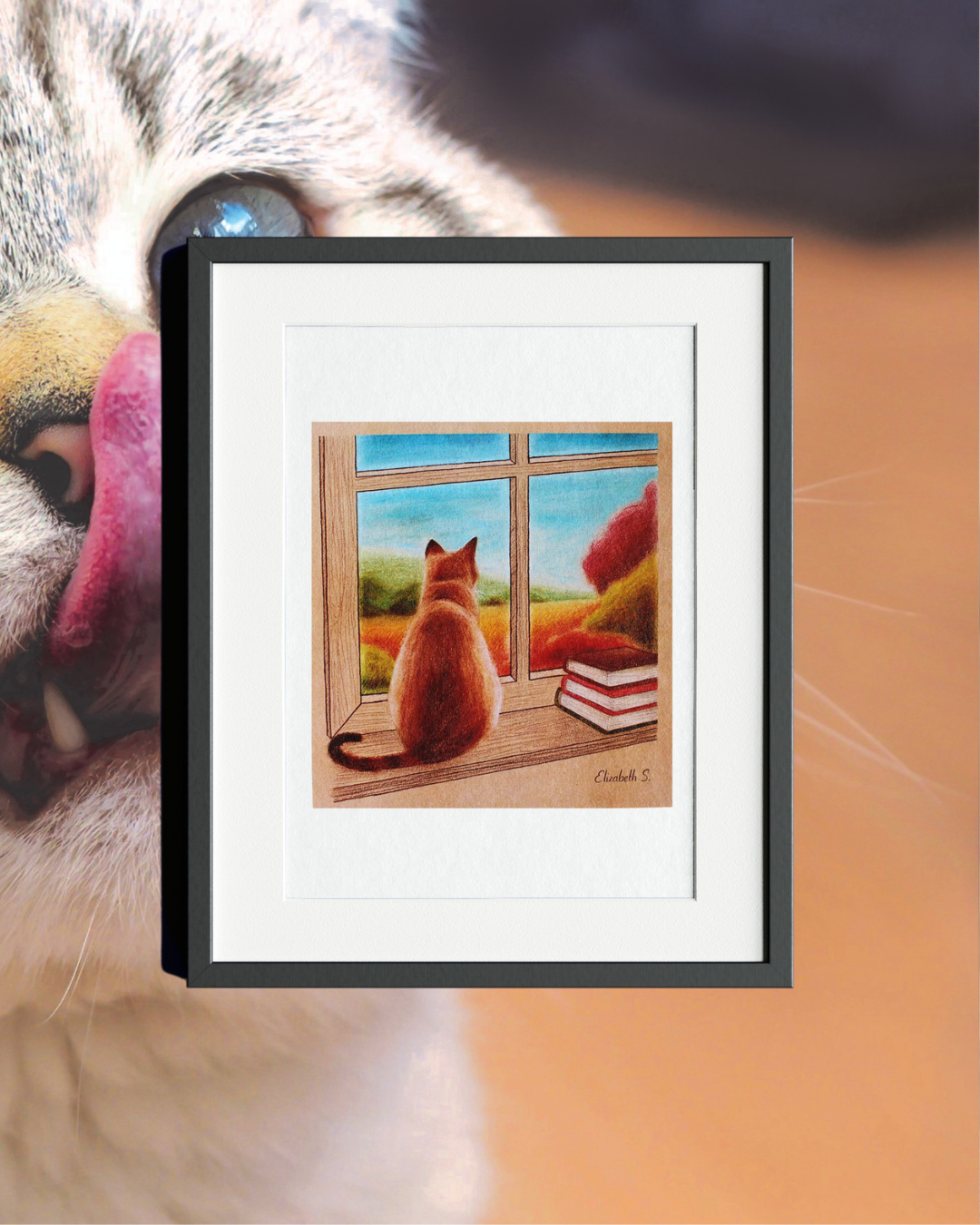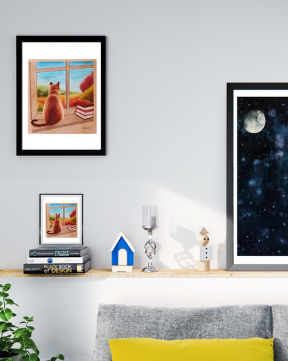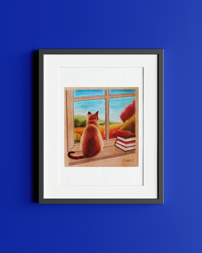 This adorable print captures the cozy essence of fall with a cat peeking out the window. 🍂🐾📚