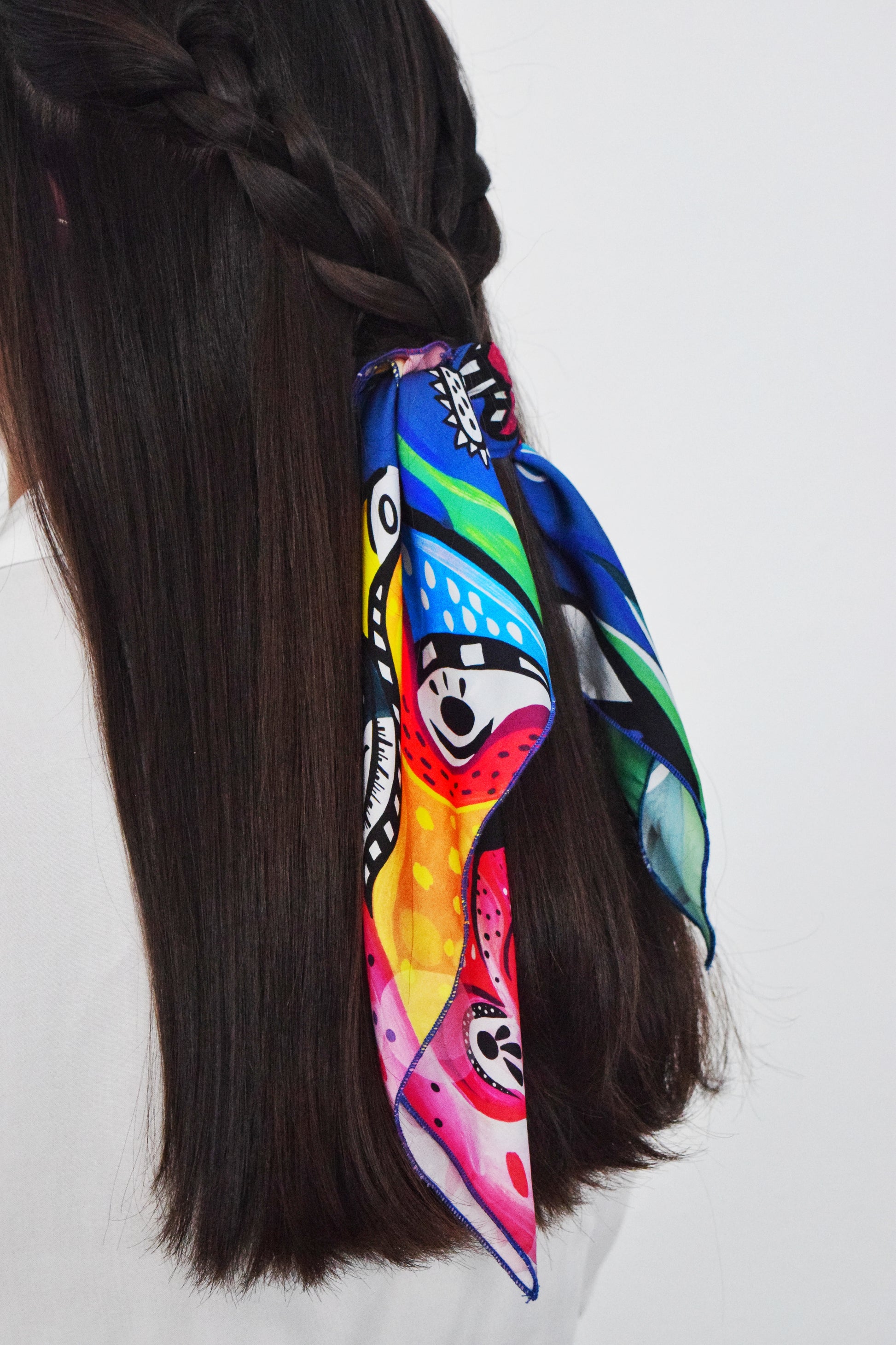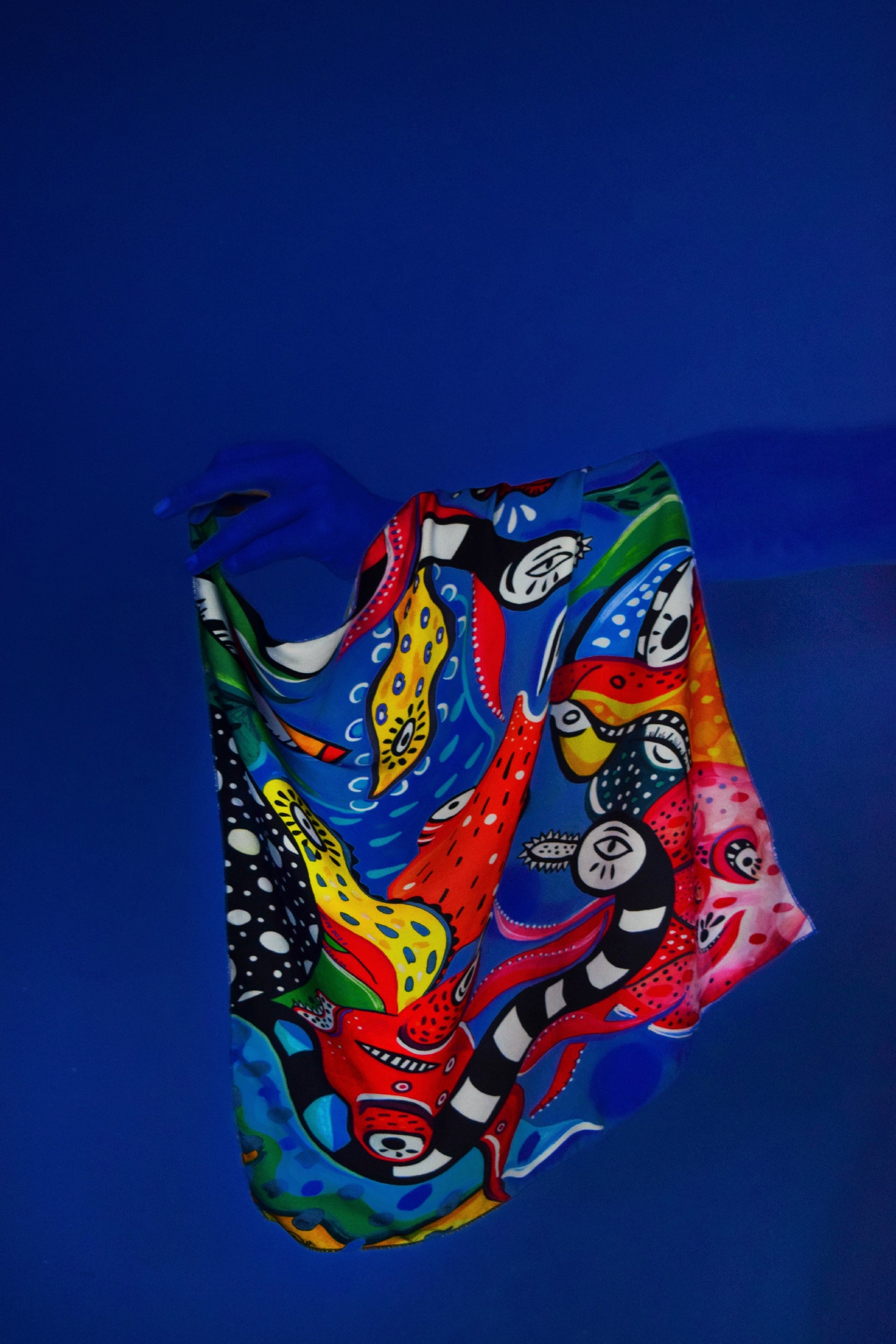 Pañuelos inspirados en la idea de tribu, donde Patricia cuenta una historia de conexión y pertenencia con sus dibujos originales, aquí podemos ver sus pulpos, peces y to lo que hay en el fondo del maaaar :)