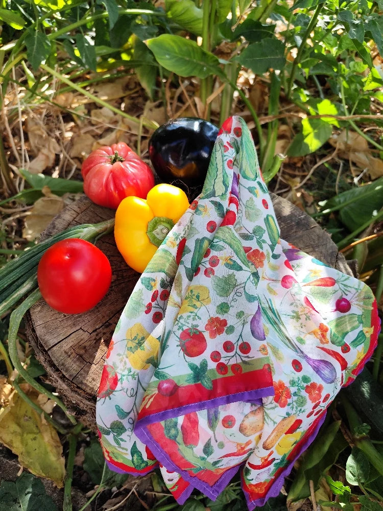 Este pañuelo es del huerto de Noelia, lleva frutas y verduras de temporada