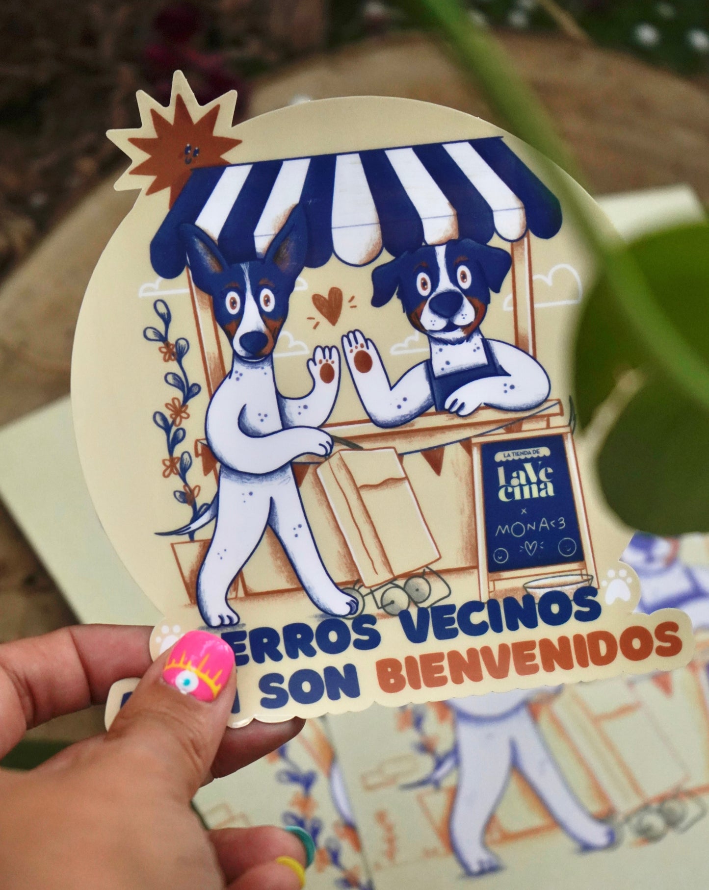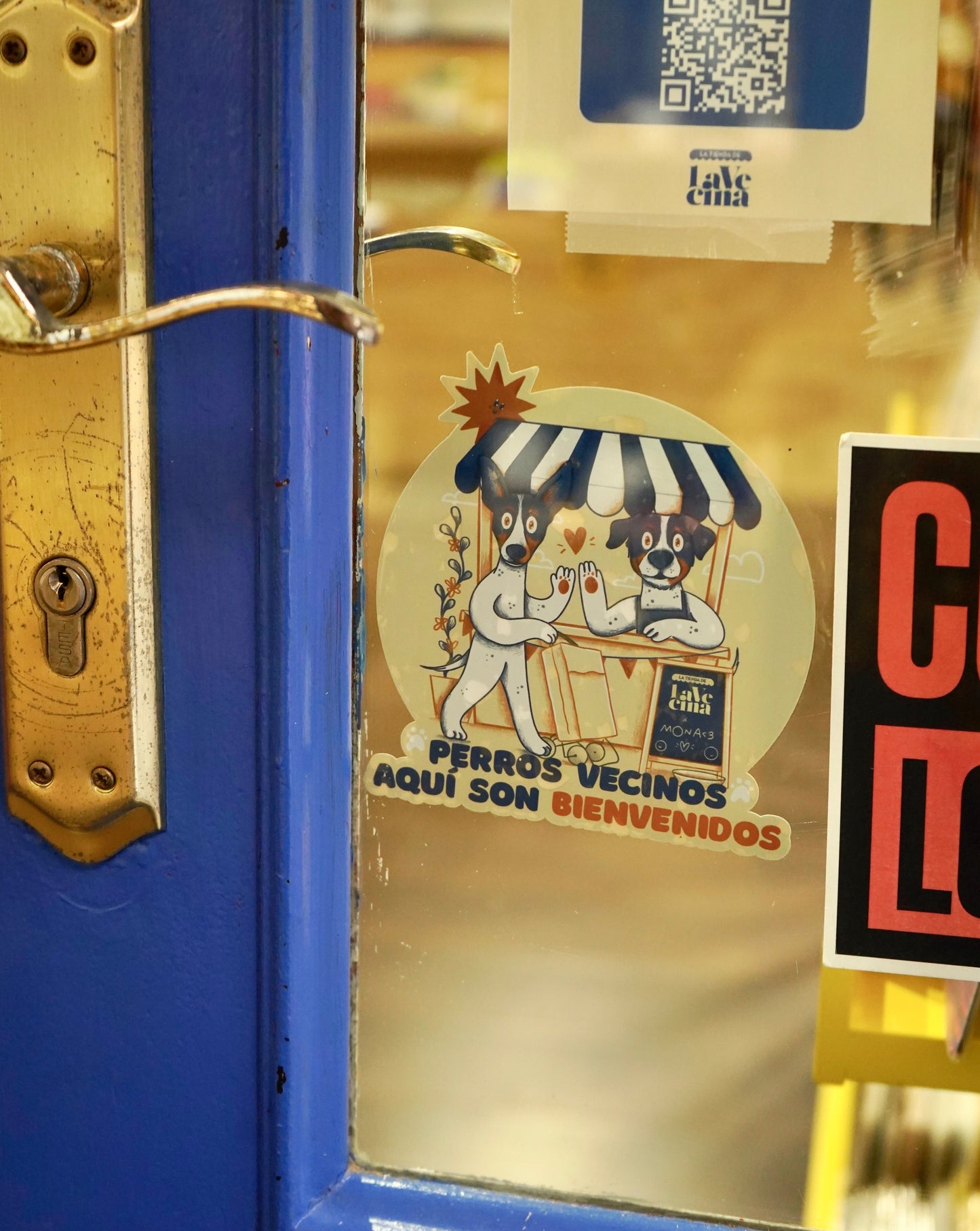 Pegatina Perros vecinos bienvenidos para comercios (interior) Mona x La Vecina