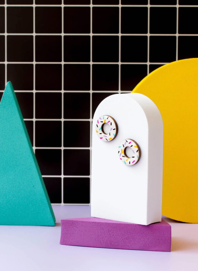 Estos pendientes están elaborados en madera recuperada de cajas de frutas, pintados a mano, y terminados con una capa de resina para dar ese toque "glossy" que encaja a la perfección con la estética de los objetos coloridos y brillantes tan característicos que crearon los artistas del grupo Memphis.