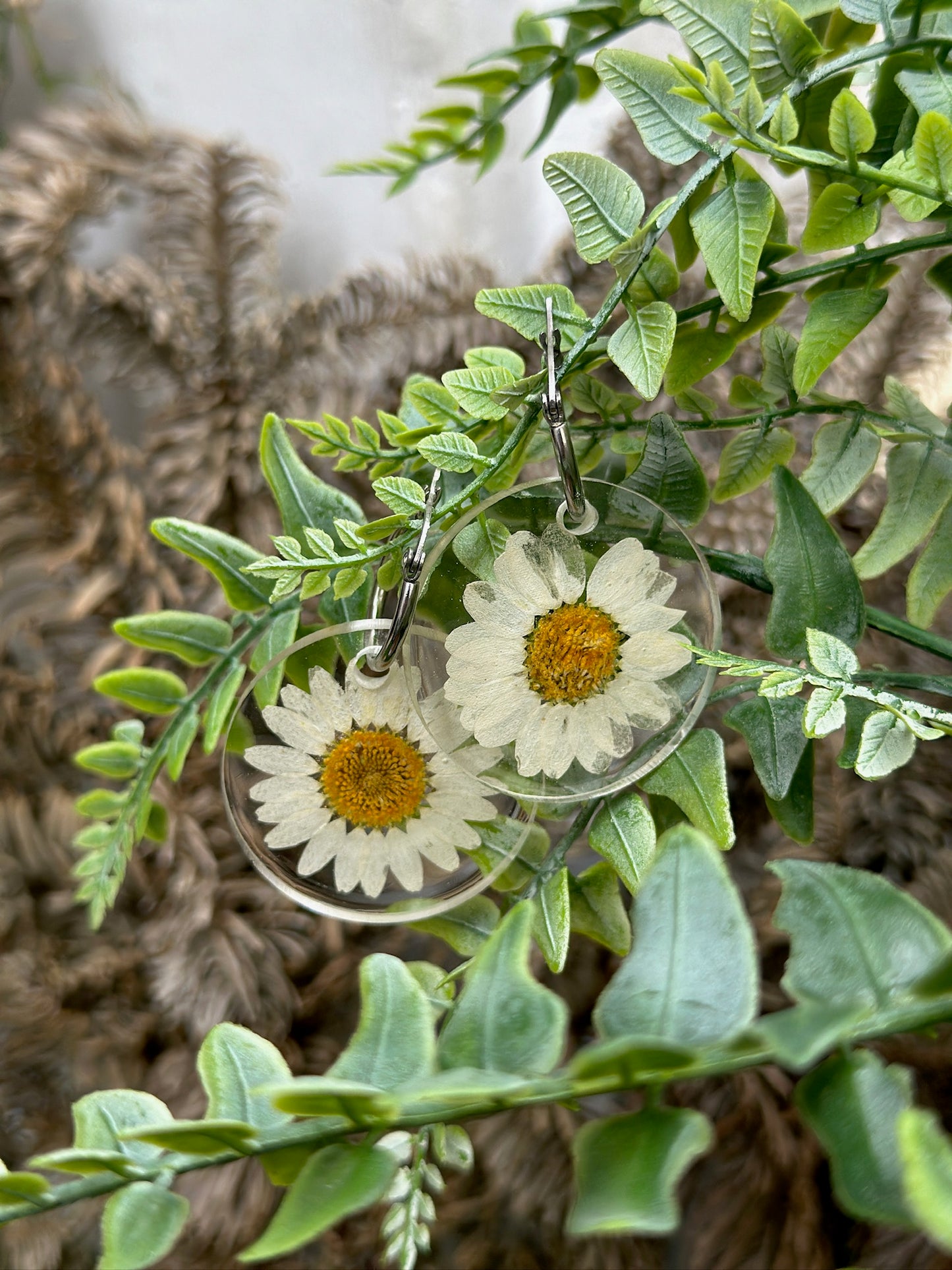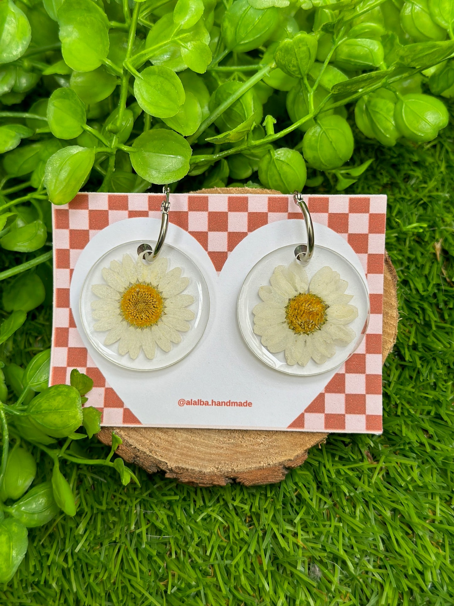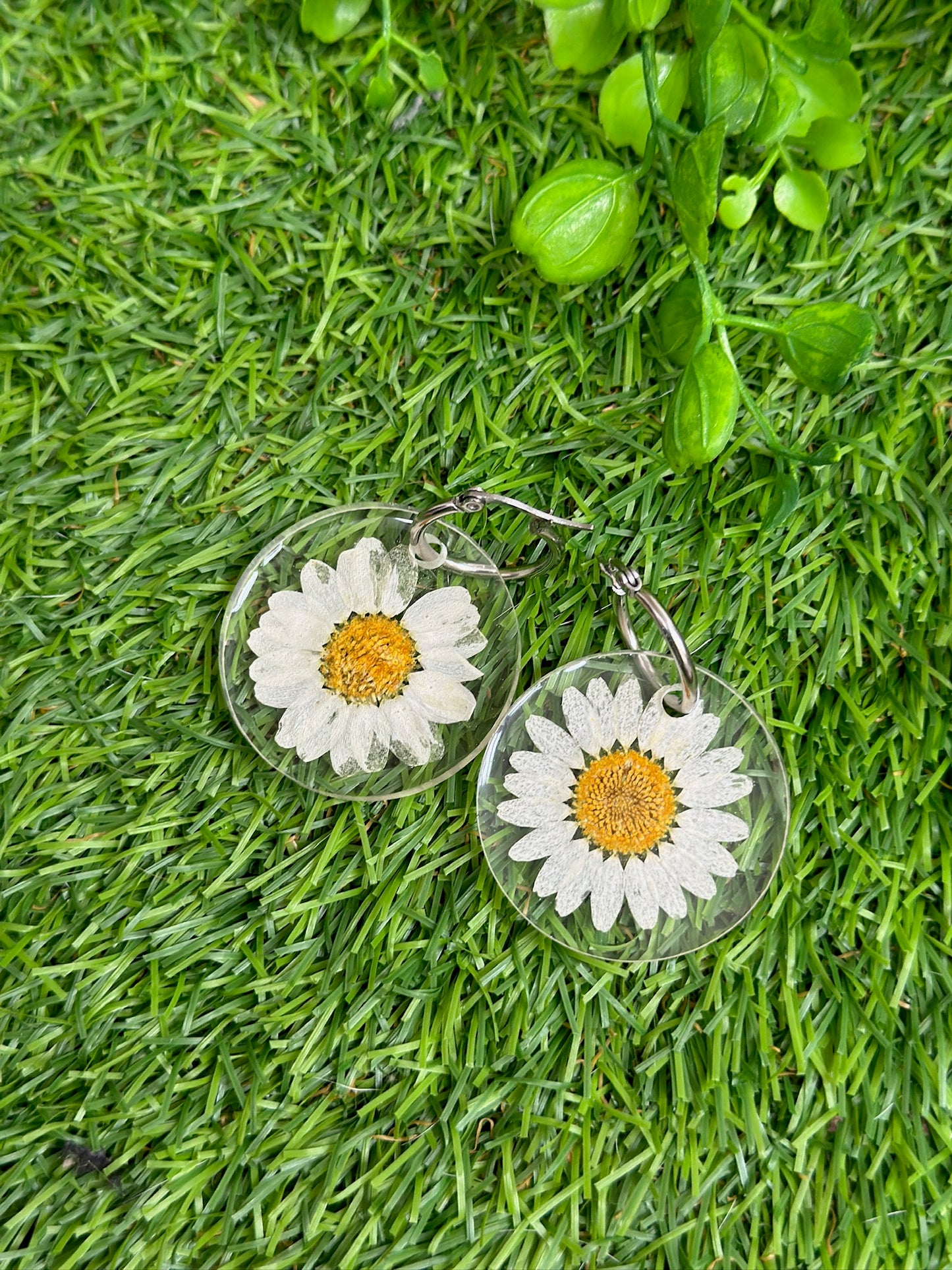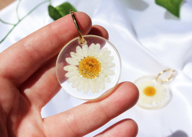 - 👉 Handmade earrings with encapsulated daisies. The ring is 20 mm and made of stainless steel. Golden ring.