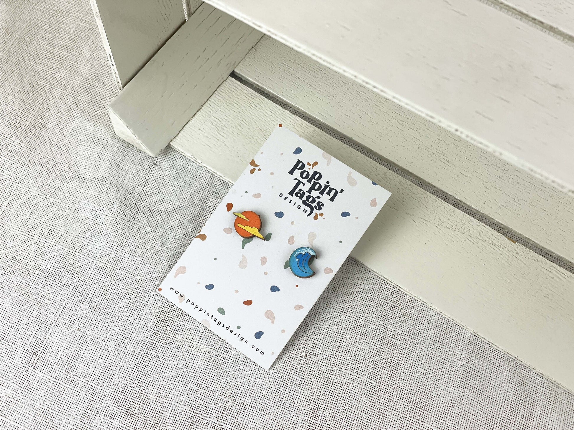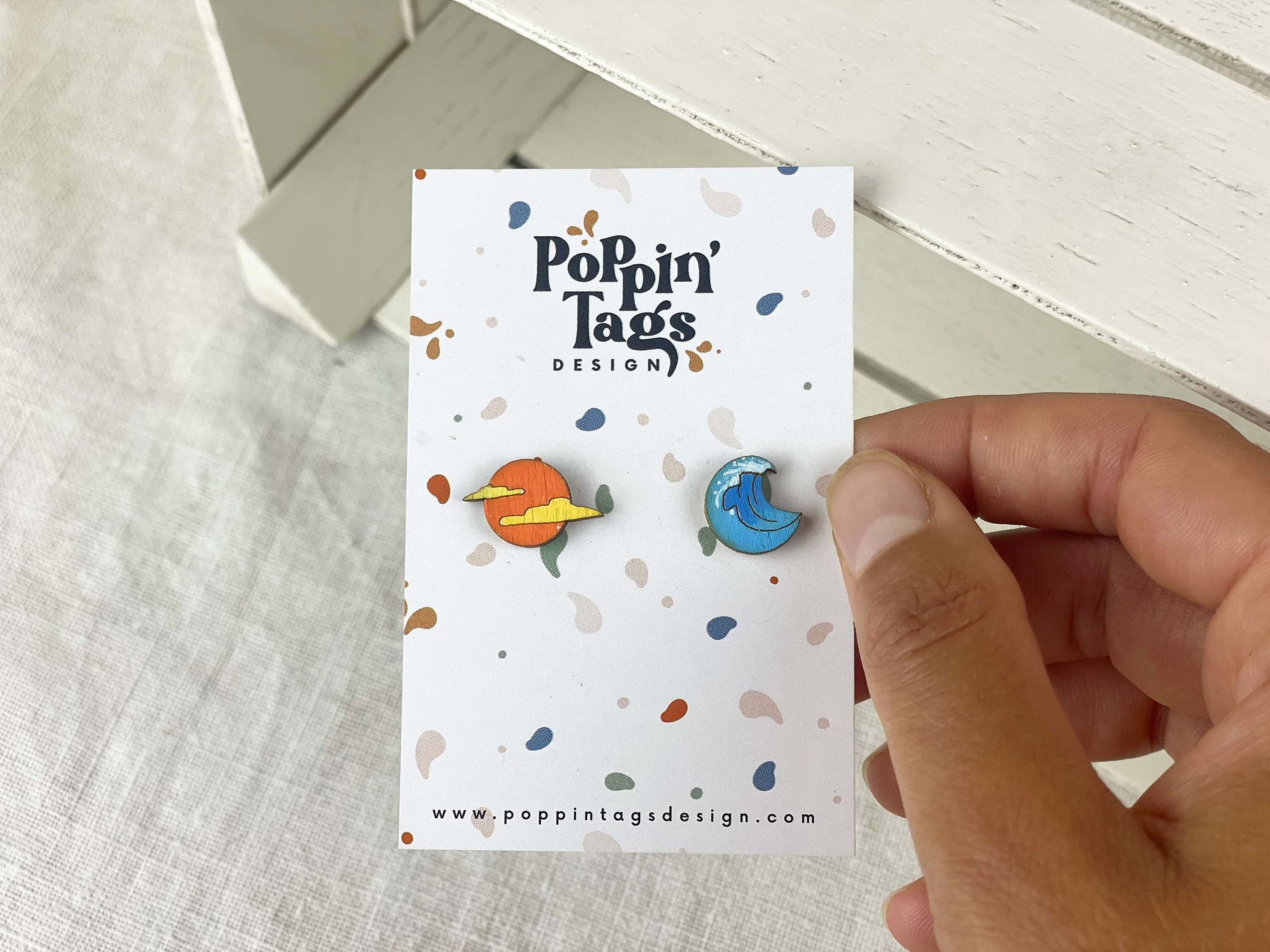 Y ponte estos pendientes de madera rollo botón… ¡diferentes pero combinados y pintados mano!