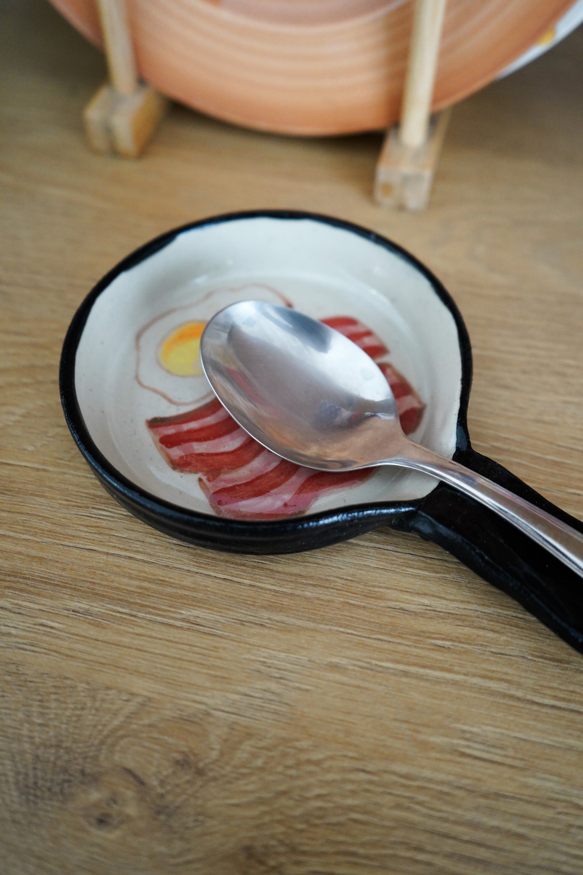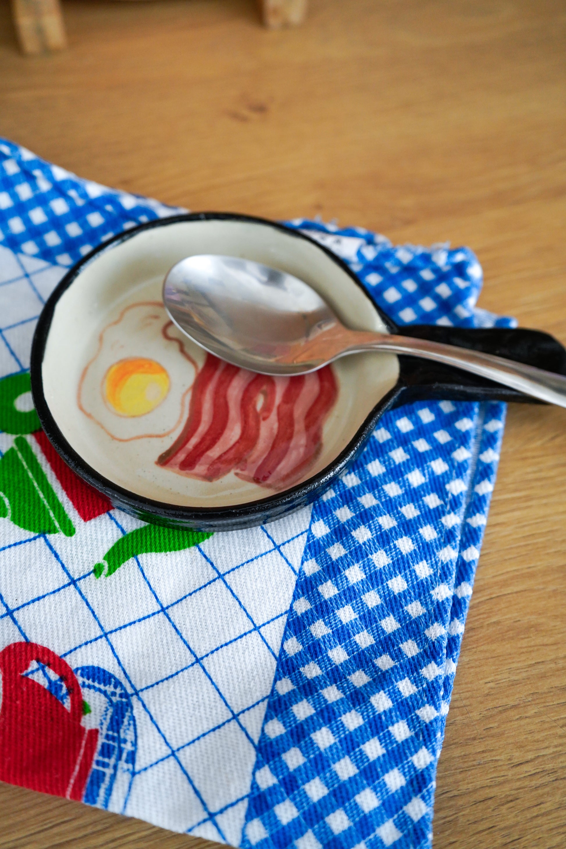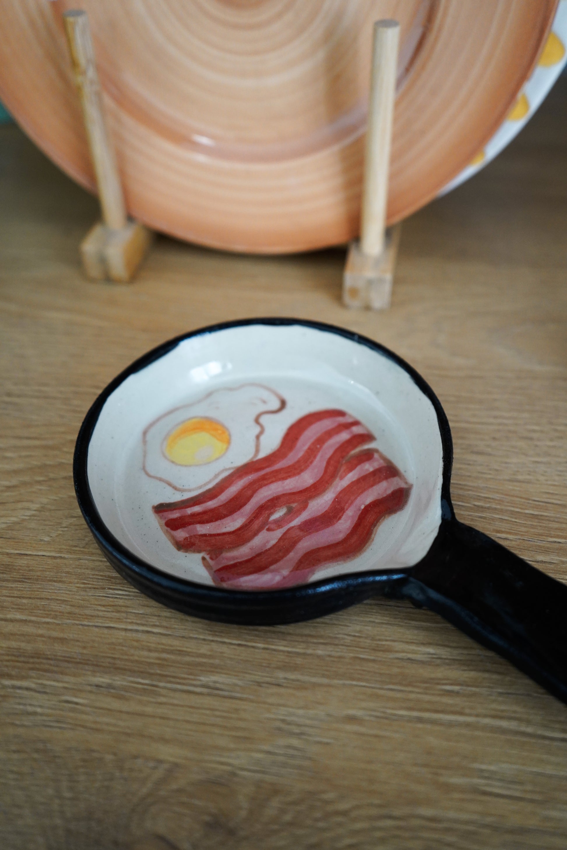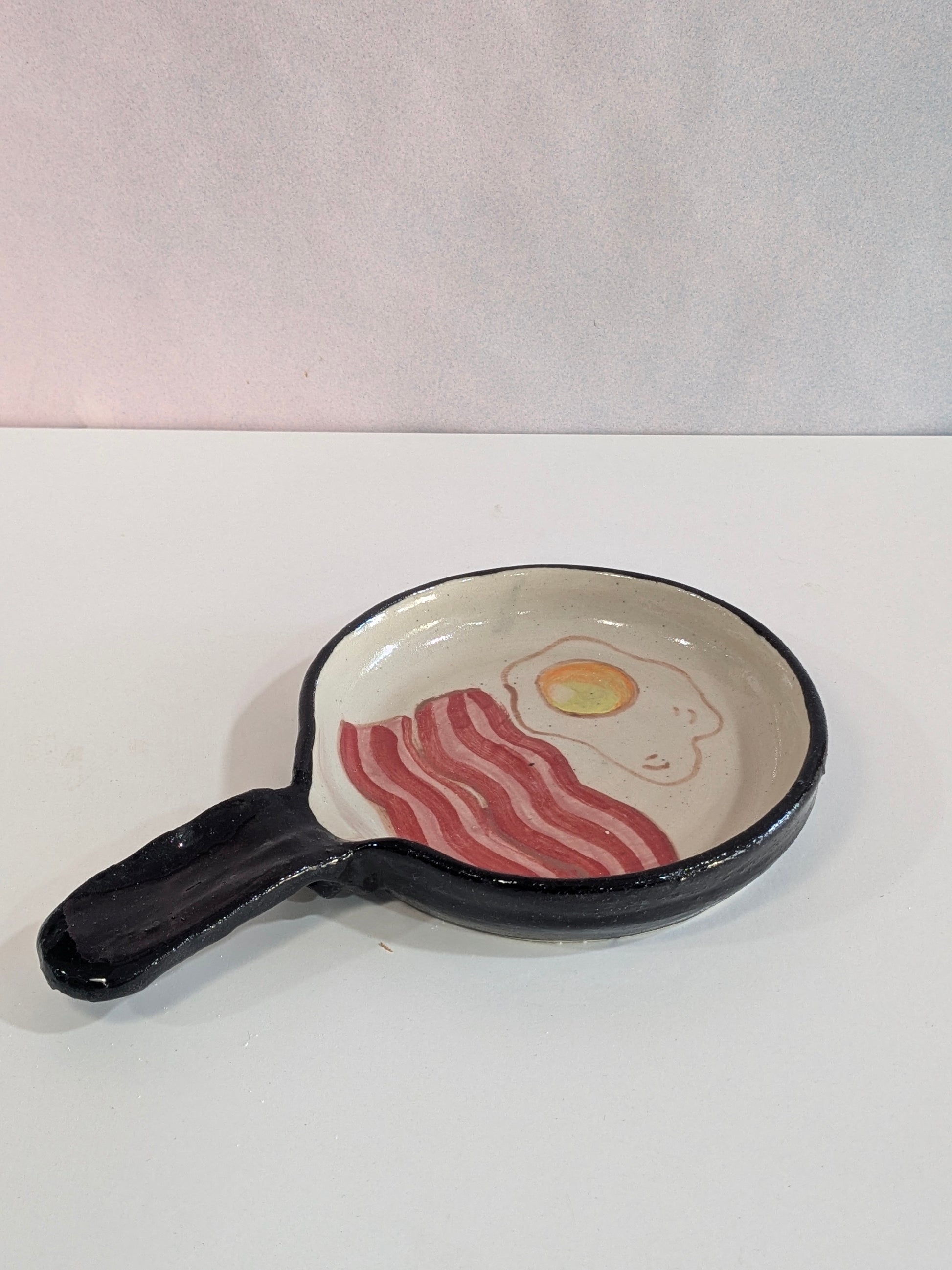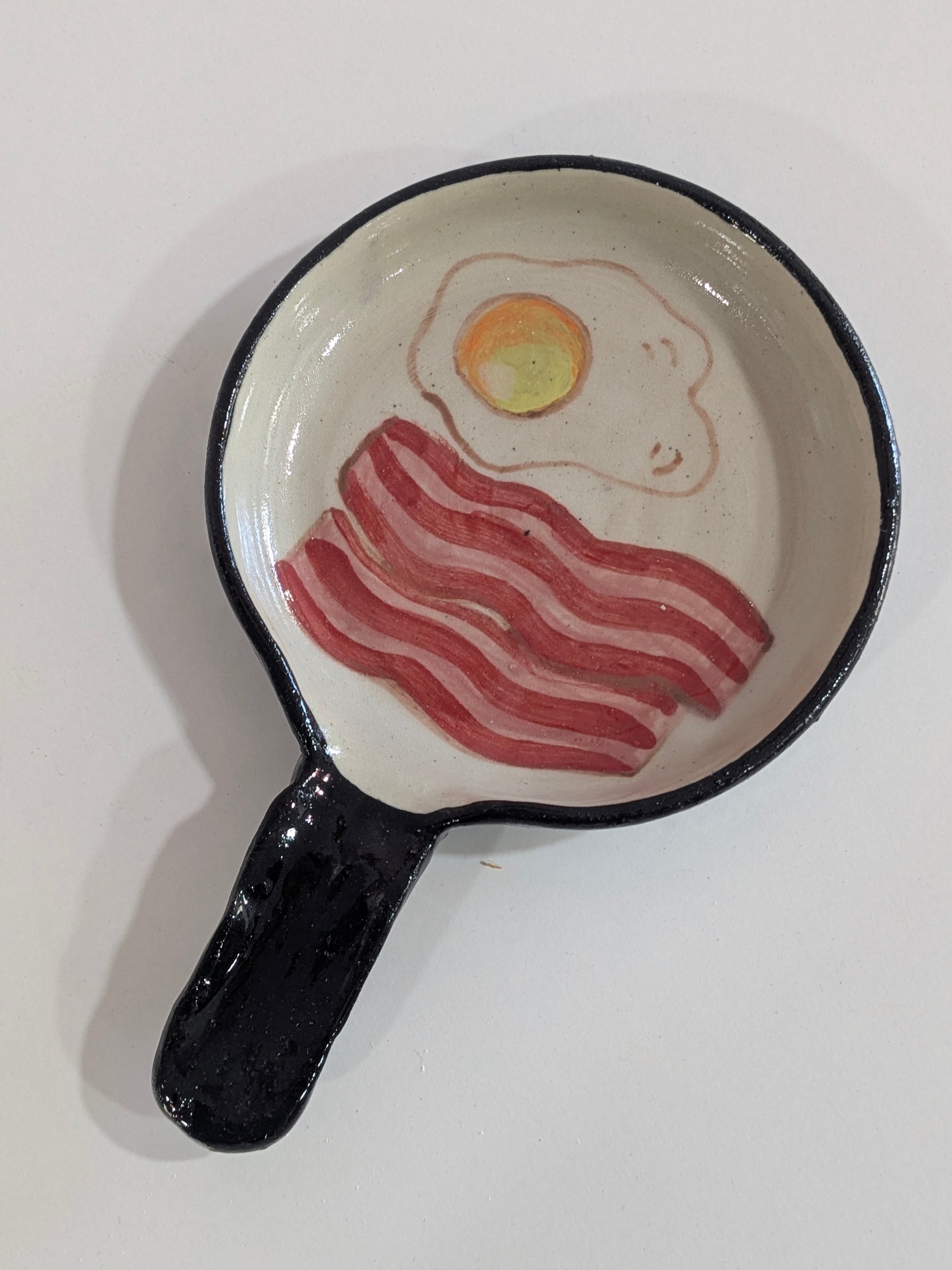 Sartén de cerámica hecha y pintada a mano, con su bacon y huevos pintaitos dentro y hasta con sus tornillitos en el asa, de to pa que apoyes la cuchara cuando estés cocinando.