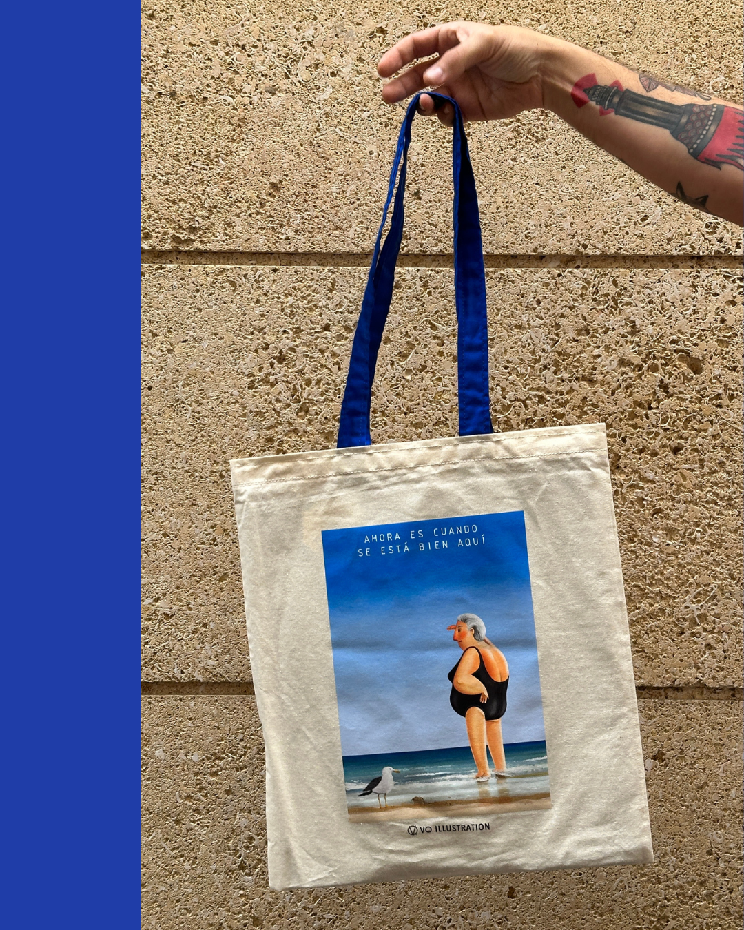 With blue handles they contrast with the natural color of the bag, and the illustration on almost the entire tote is to make a statement. 🌊🦩