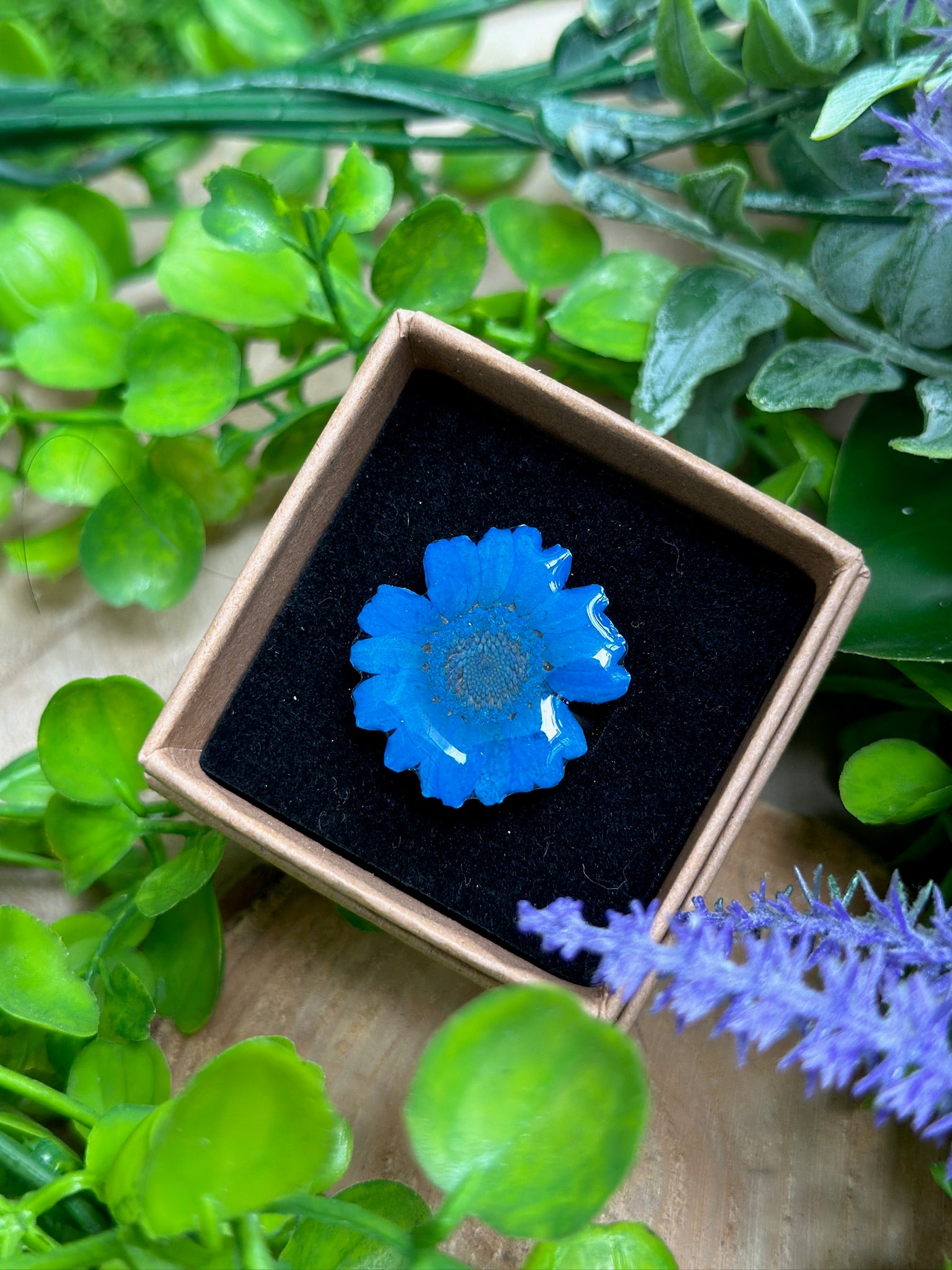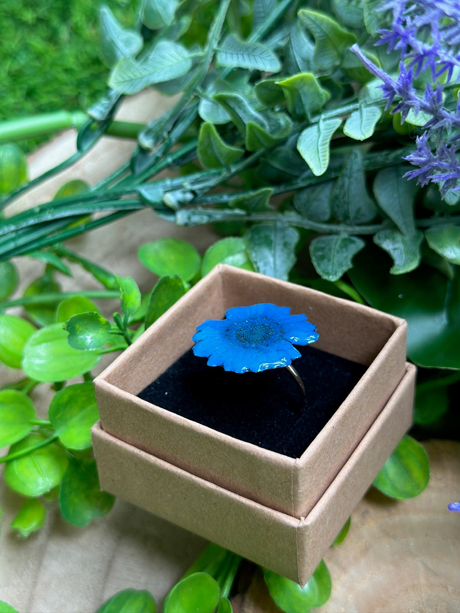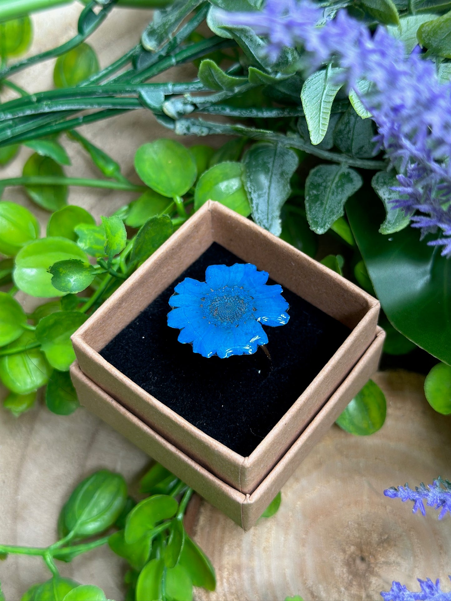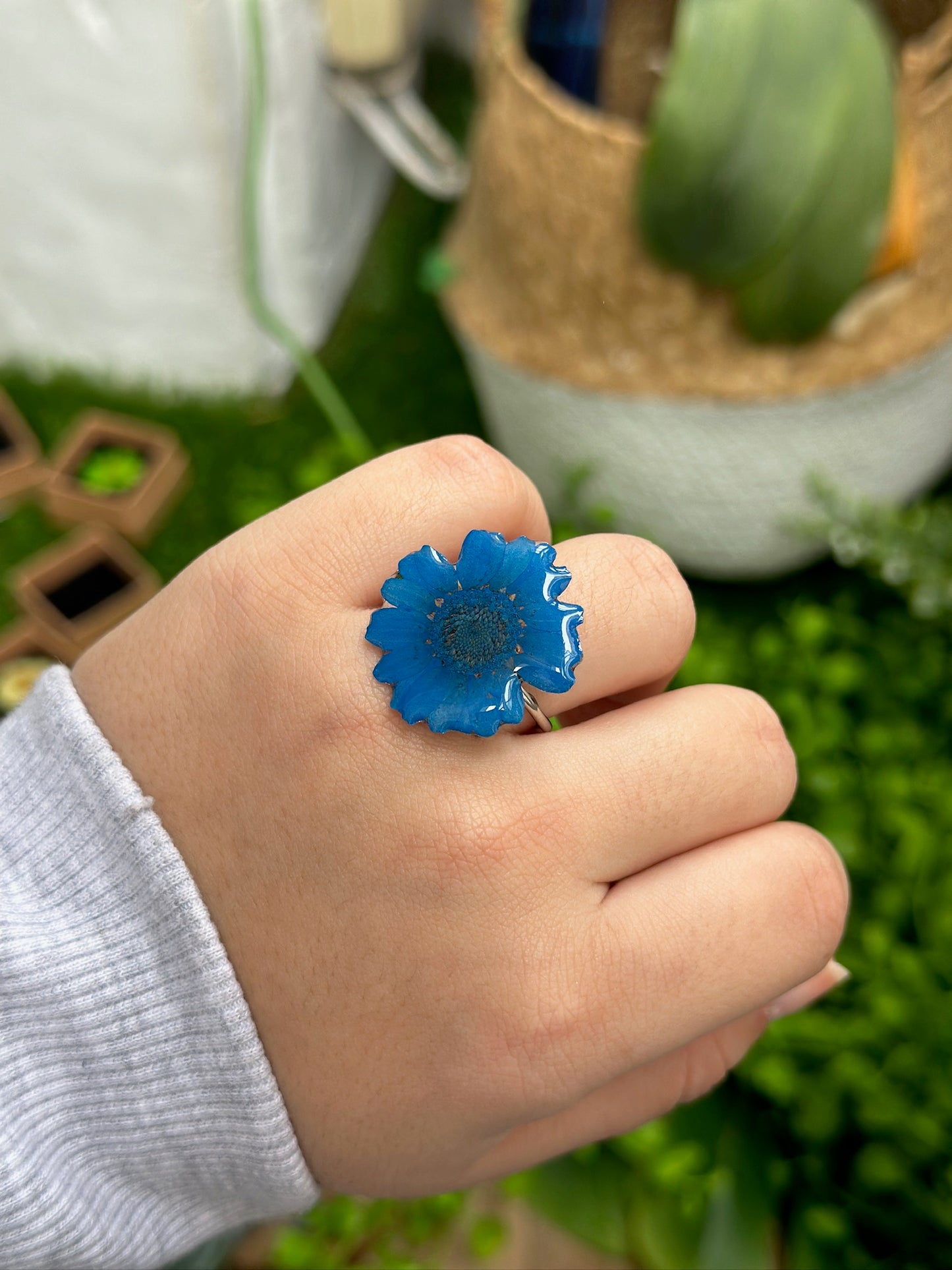 Este anillo con margarita azul encapsulada quedan tan tan bonito.