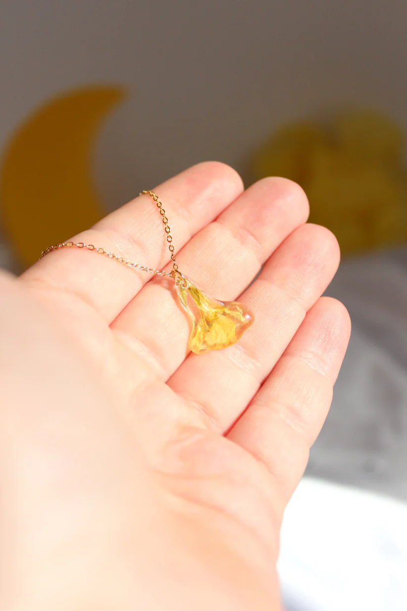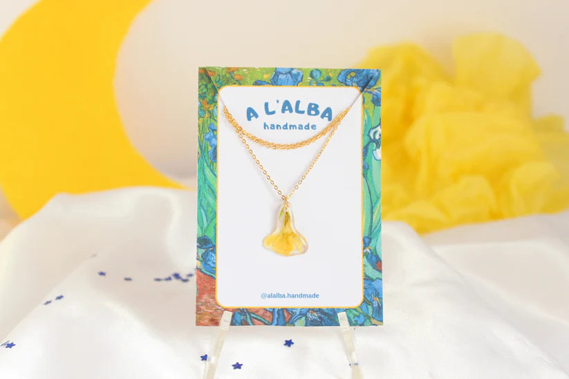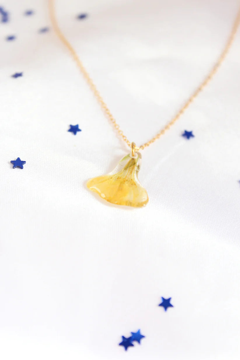 Collar hecho a mano de pequeña flor amarilla encapsulada en resina.