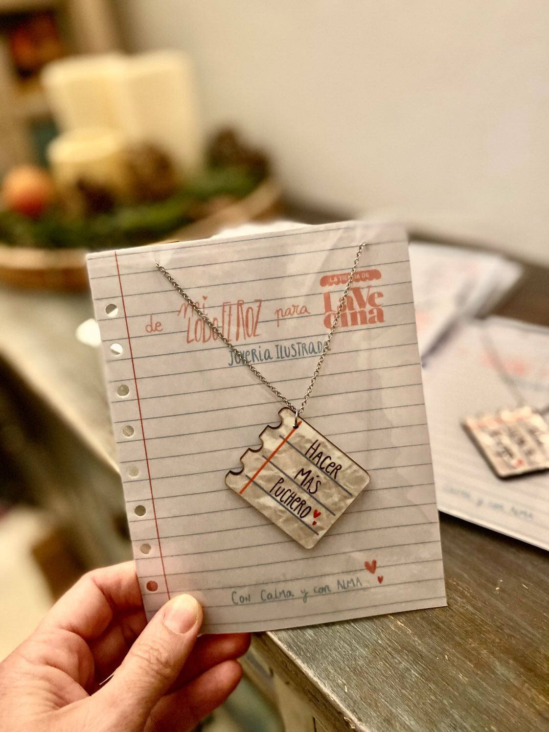 - Collar ilustrado en madera, colabo única de la tienda y mi lobo feroz