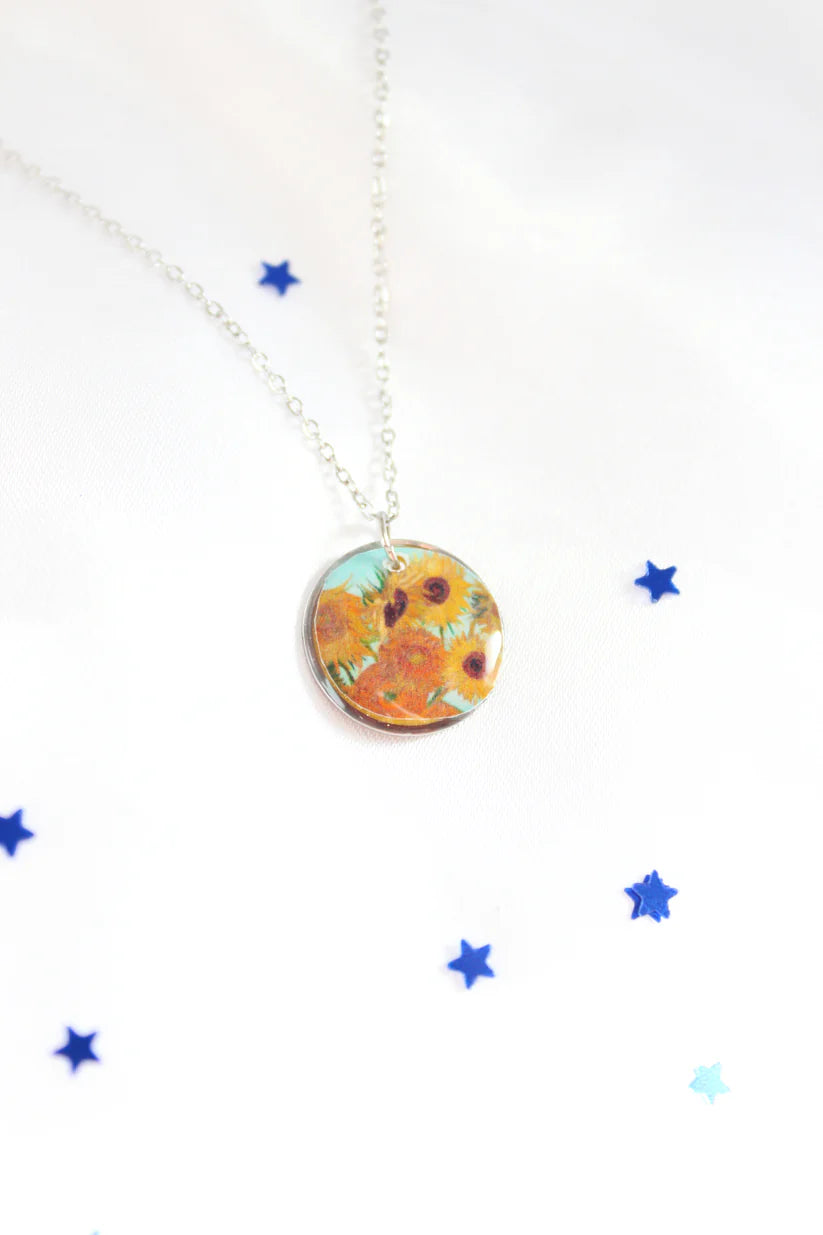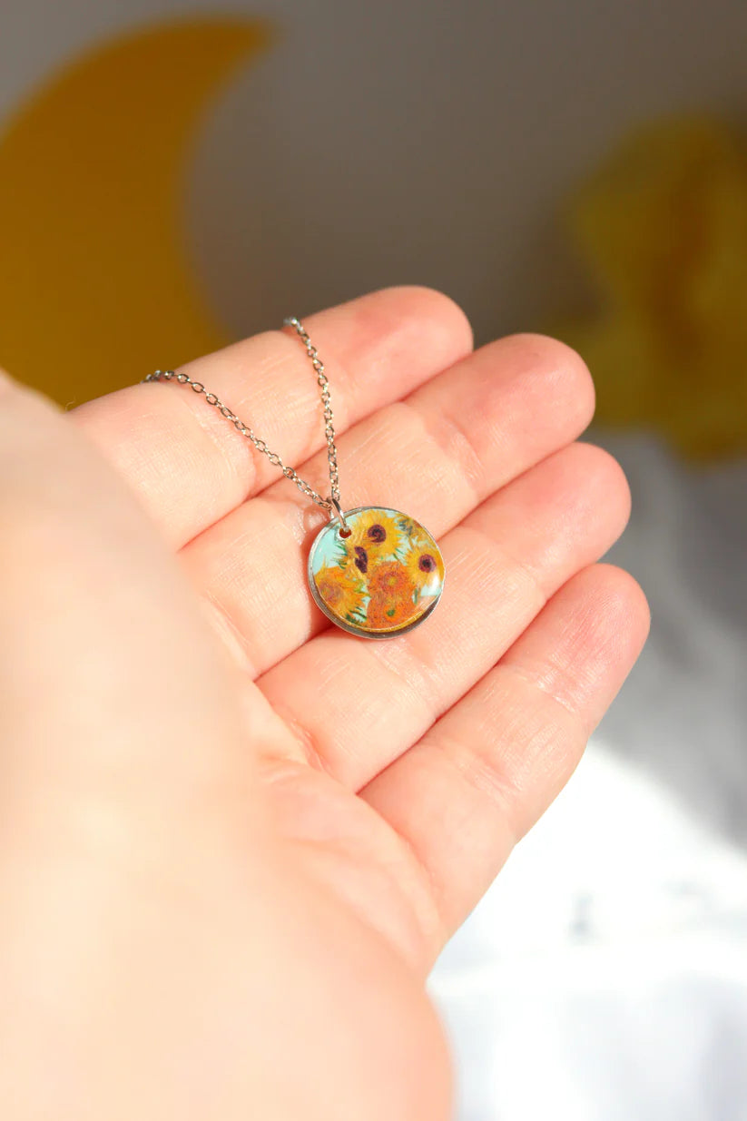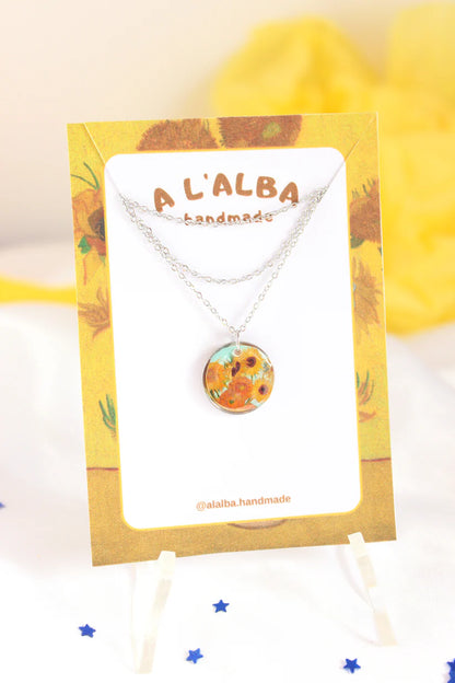 Collar plateado hecho a mano de la obra Jarrón con doce girasoles de Van Gogh.