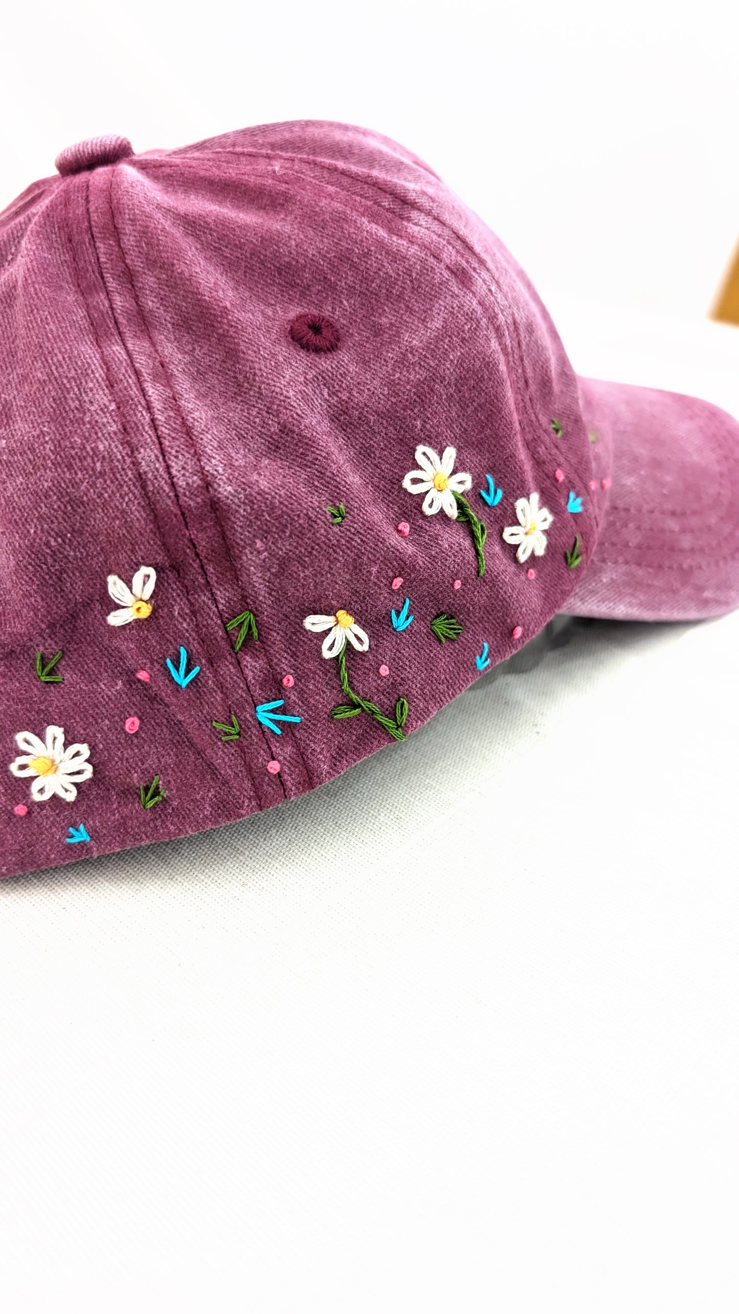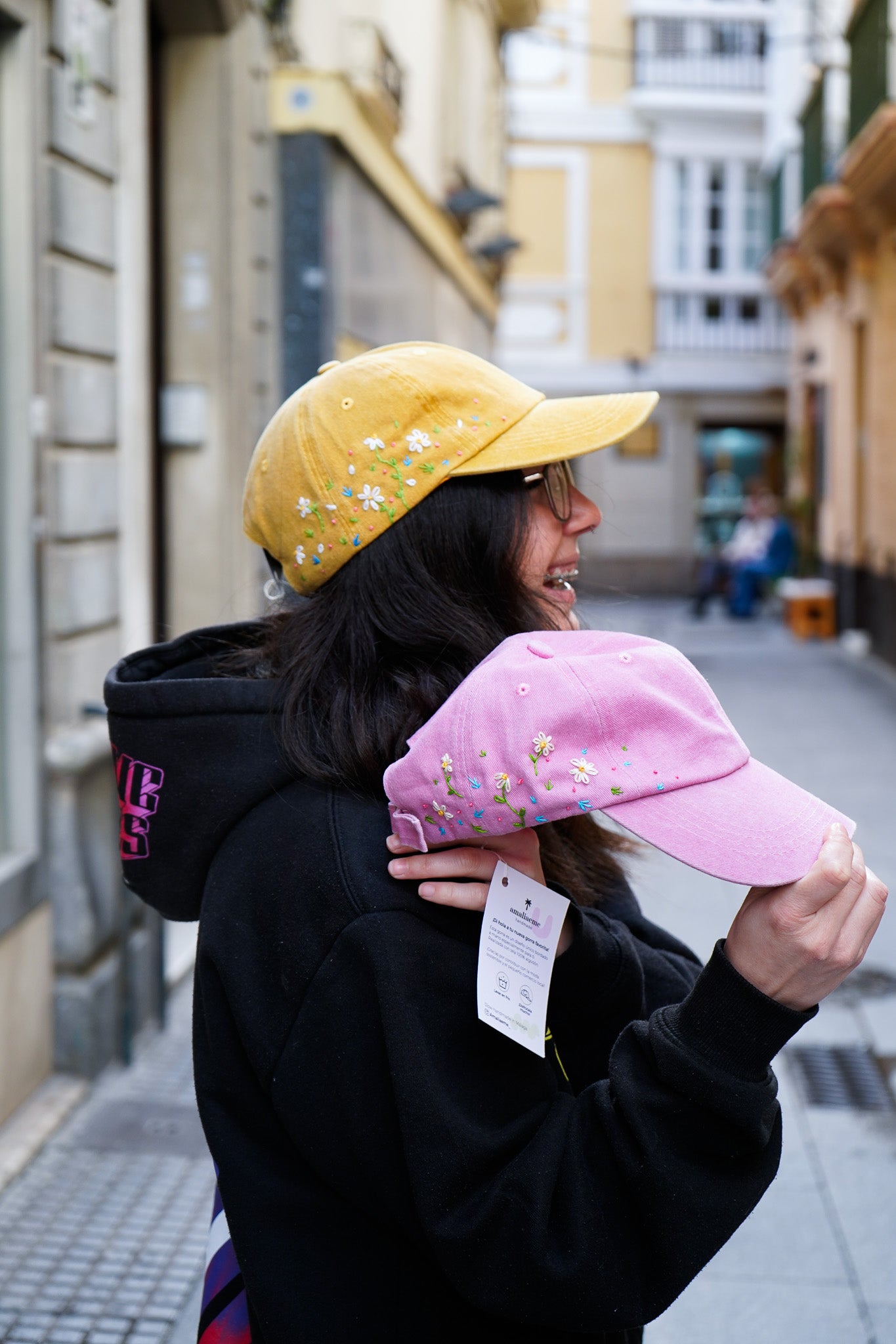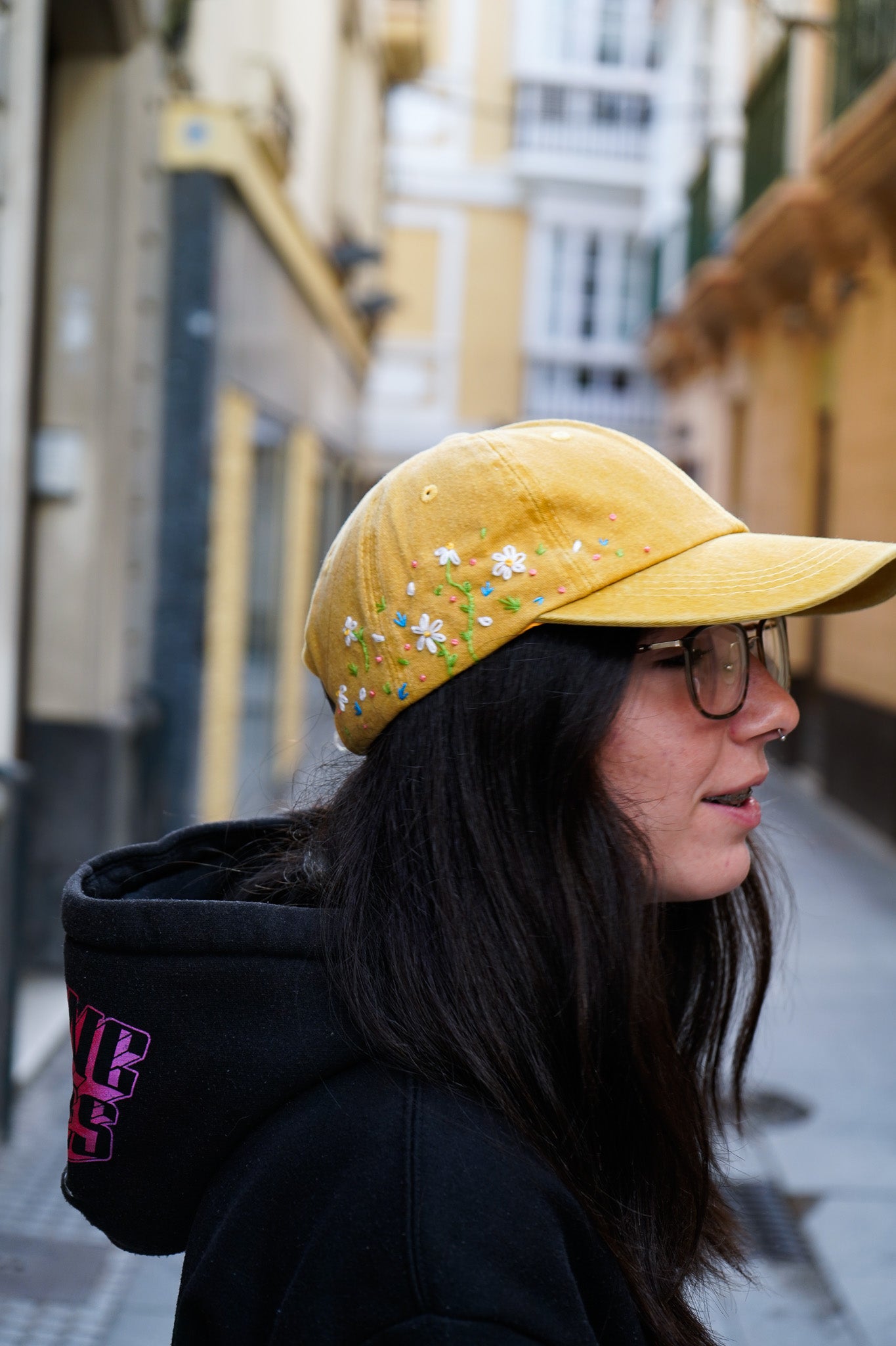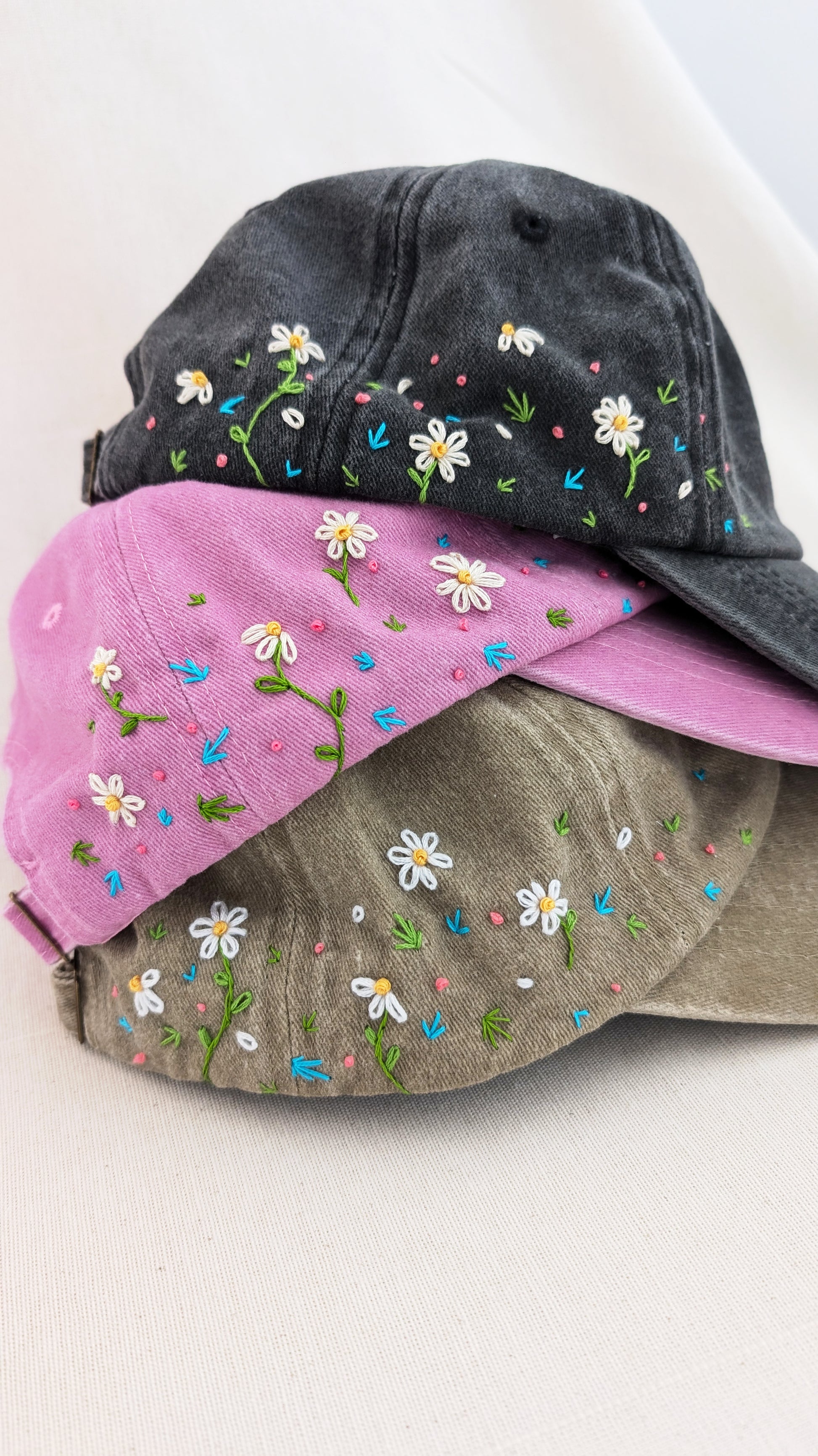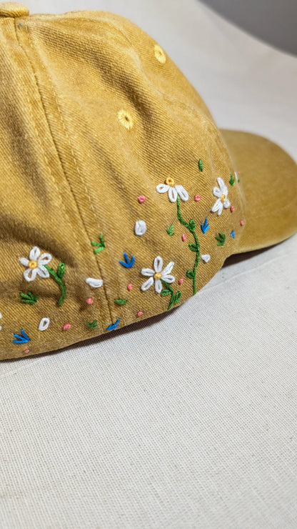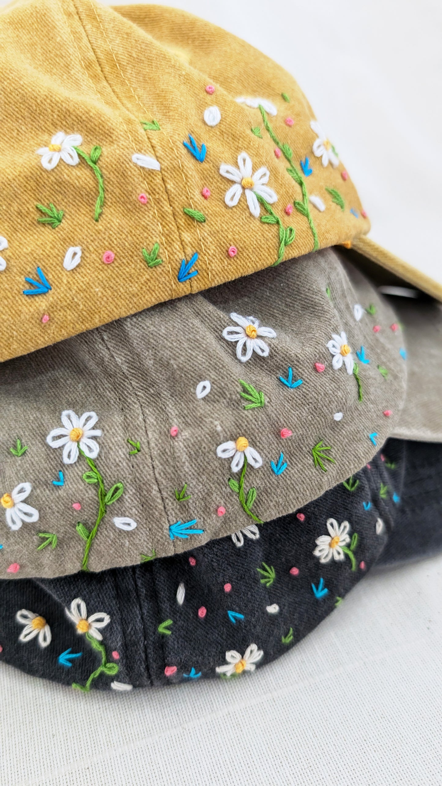 Estas gorras están bordadas a mano alrededor de margaritas y sol.