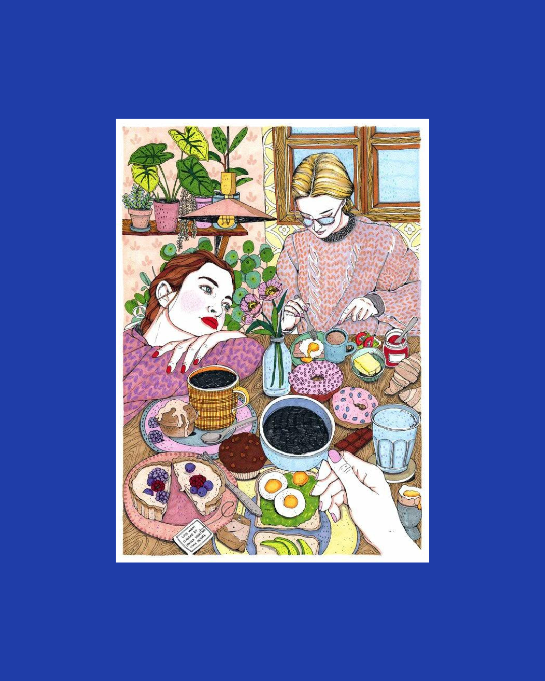 Lámina A4 Chicas desayuno pensativa y taza de café