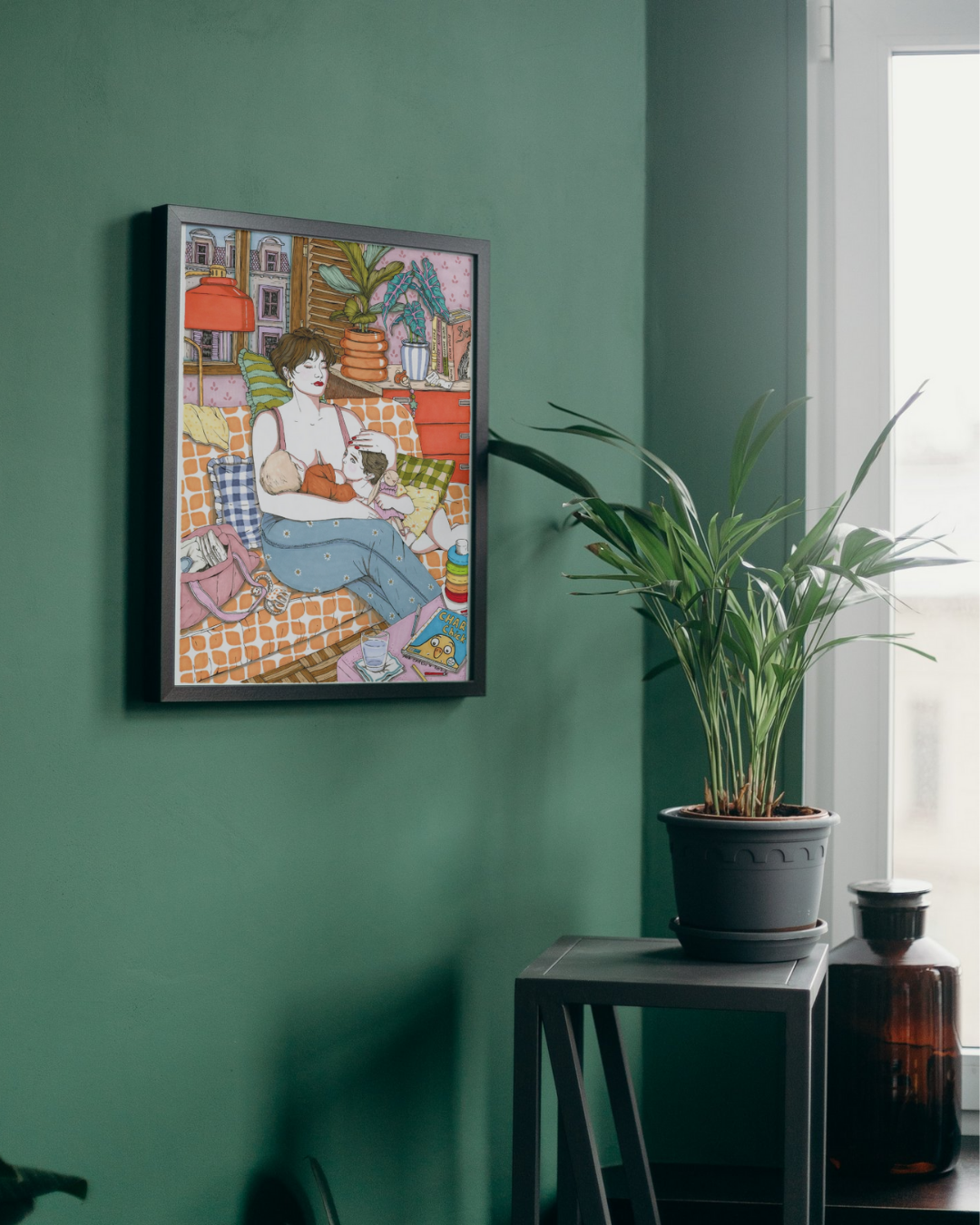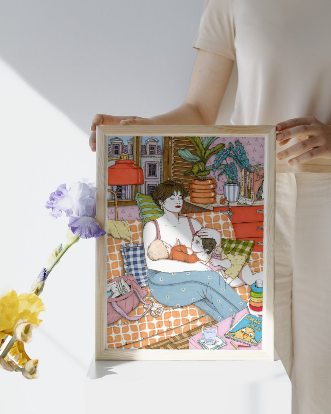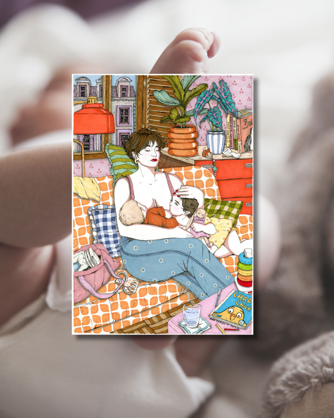 Lámina A4 Mujer dando pecho a dos en el sofá
