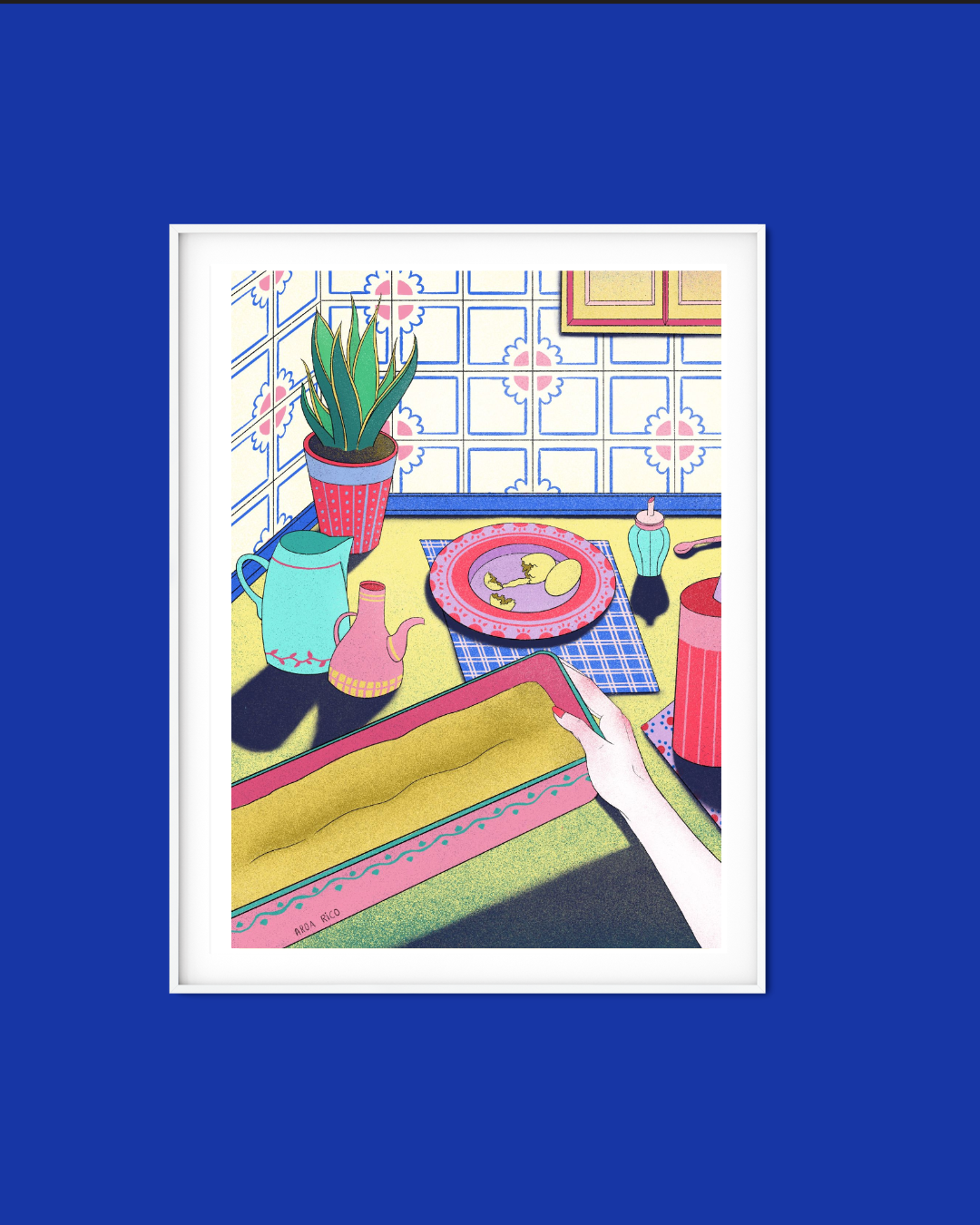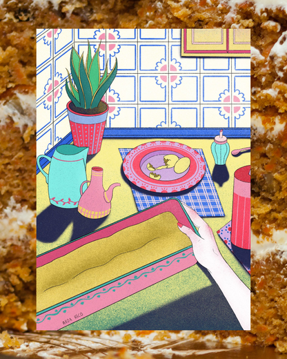 Con una paleta vibrante de tonos morados, amarillos y azules que dan vida a una escena cotidiana, pero llena de encanto: la creación de un delicioso bizcocho.