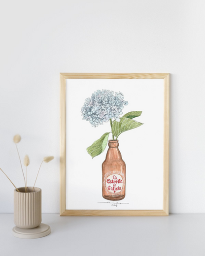 Un botellín vintage de Estrella Galicia (a mellor cervexa), acompañado de una hortensia azul tan común y característica de los jardines y paisajes gallegos 🌸🍺.