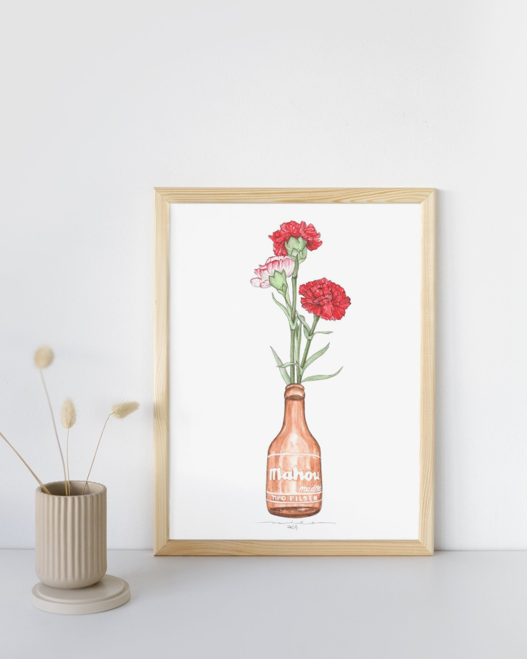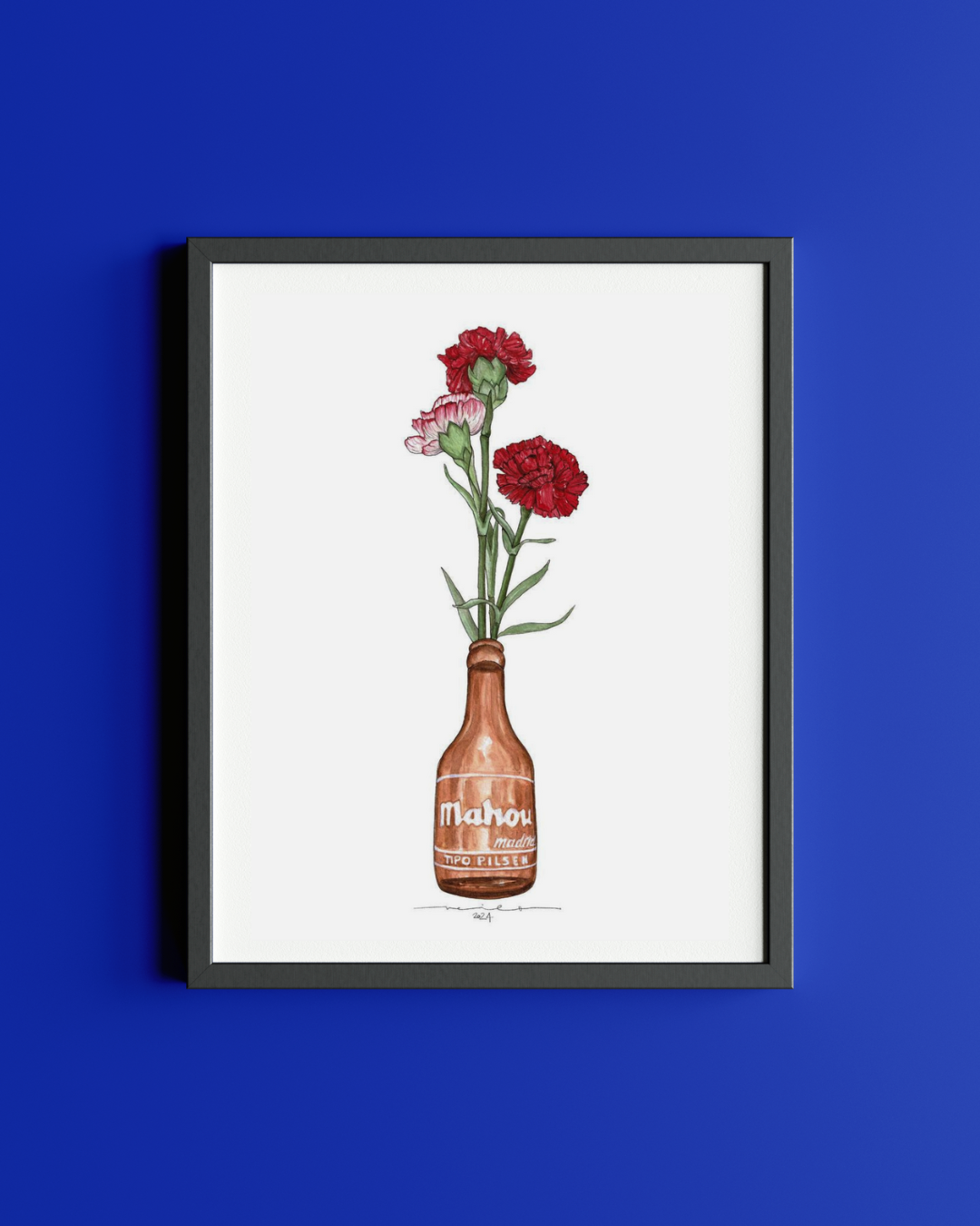 Un botellín vintage de Mahou (mazo bueno), pero no cualquiera sino el famoso botellín conocido como "el Botijo"... con los claveles clásicos de San Isidro.