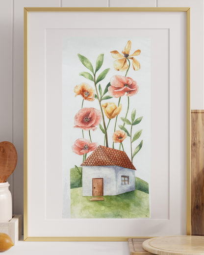 Ana dibuja y recorta las casitas y las flores de este hogar y con todo mezclaito crea esta fantasía de lámina que quedará genial en cualquier rincón de tu hogar.
