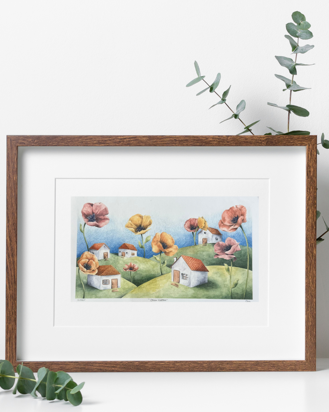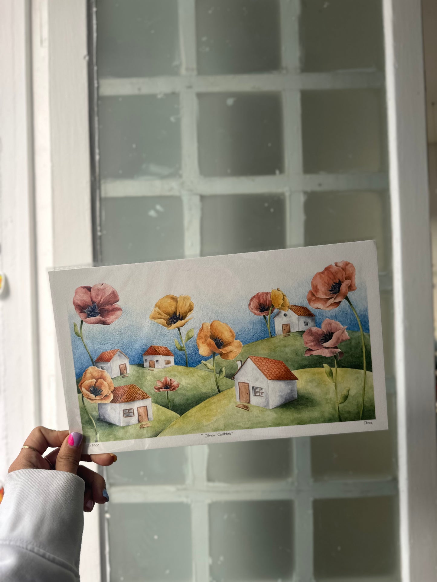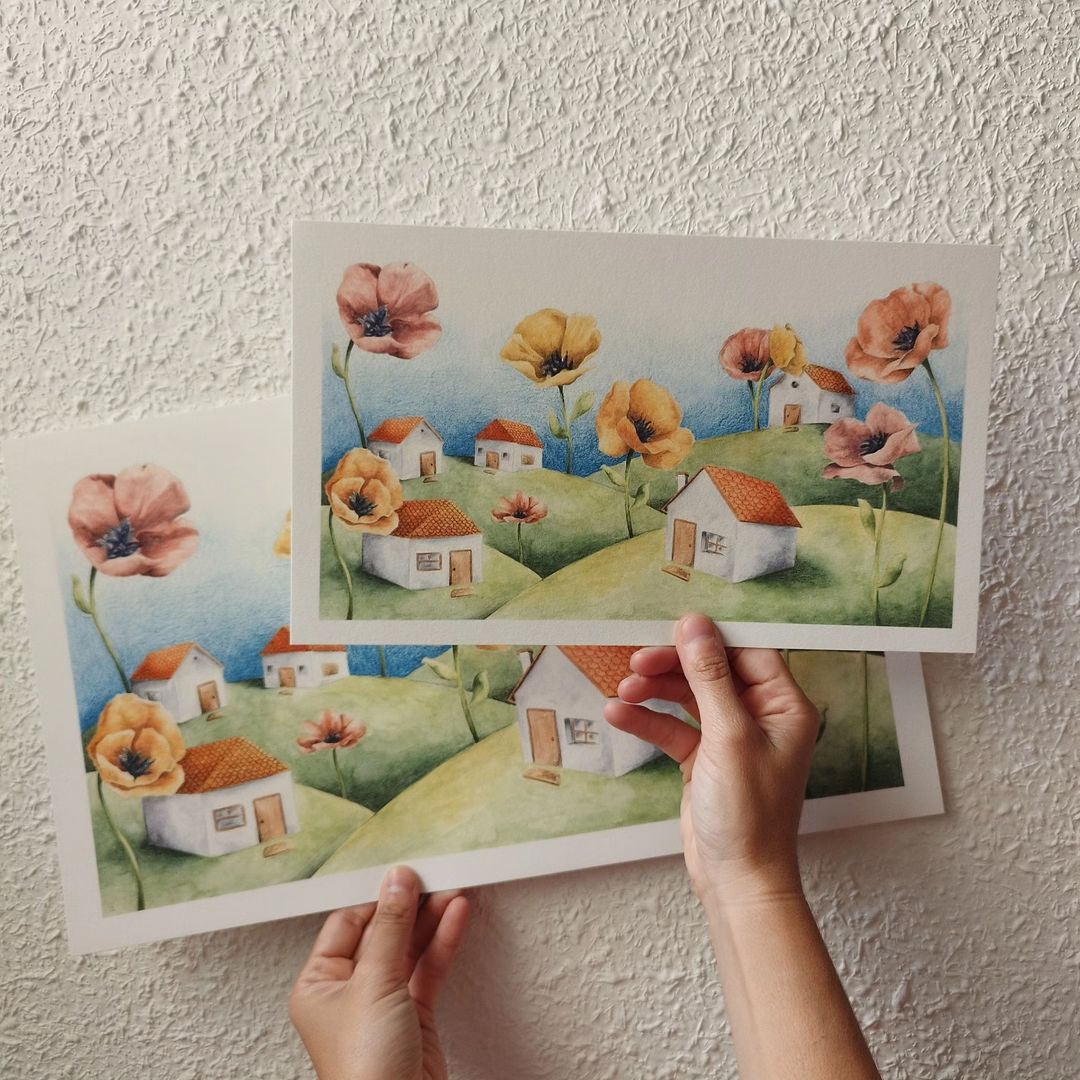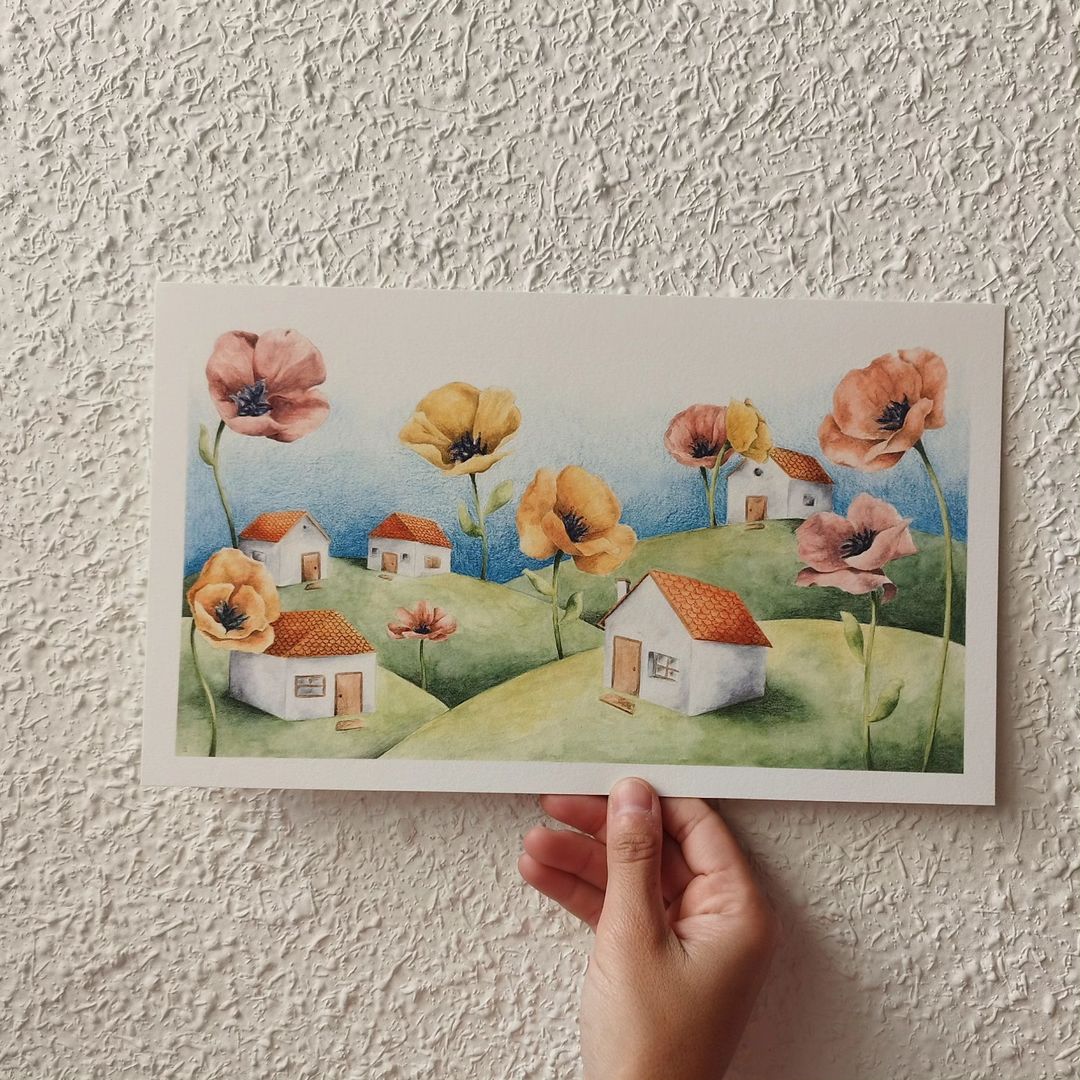 Ana dibuja y recorta las casitas y las flores de este hogar y con todo mezclaito crea esta fantasía de lámina que quedará genial en cualquier rincón de tu hogar.