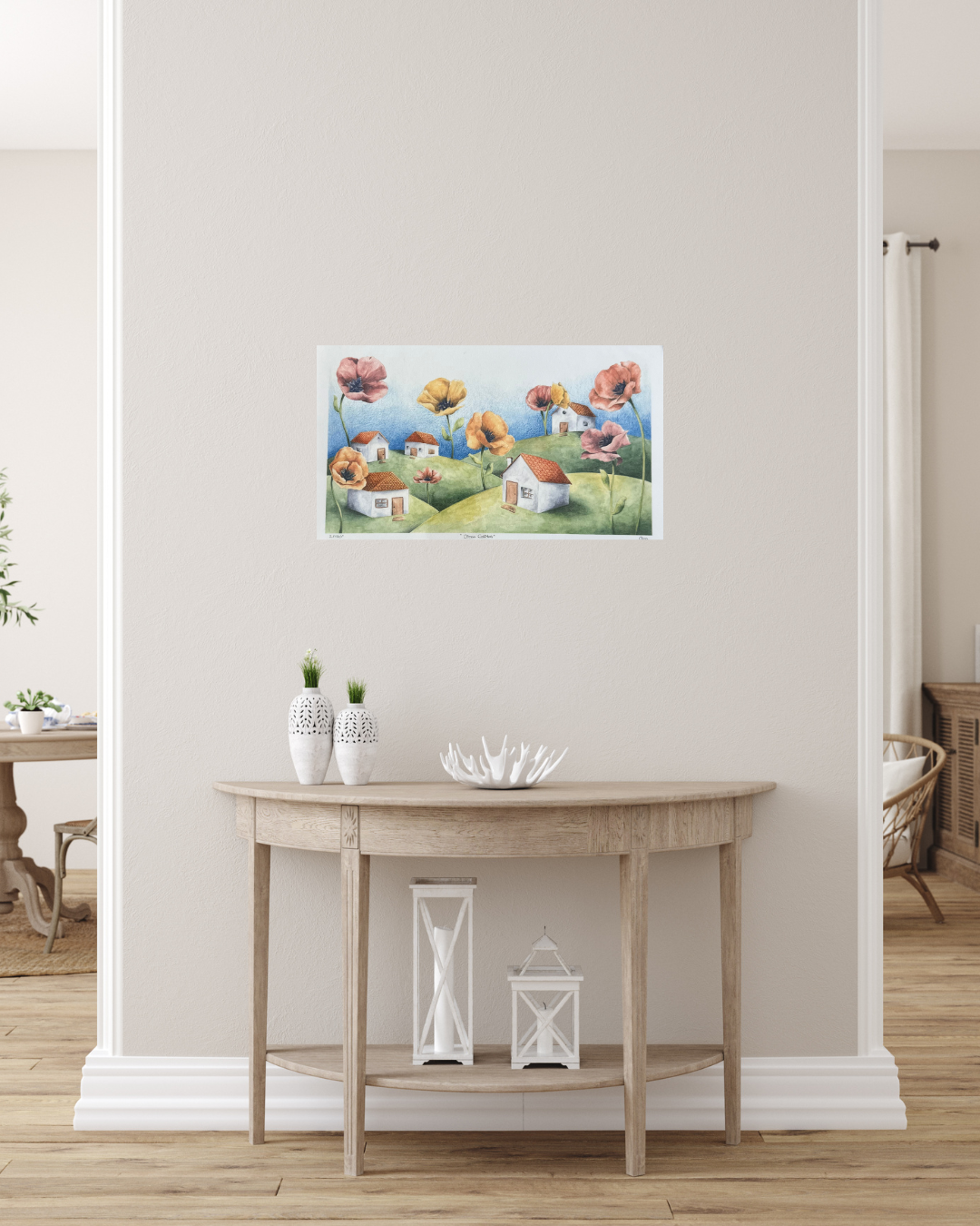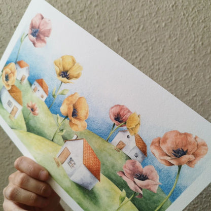 Ana dibuja y recorta las casitas y las flores de este hogar y con todo mezclaito crea esta fantasía de lámina que quedará genial en cualquier rincón de tu hogar.