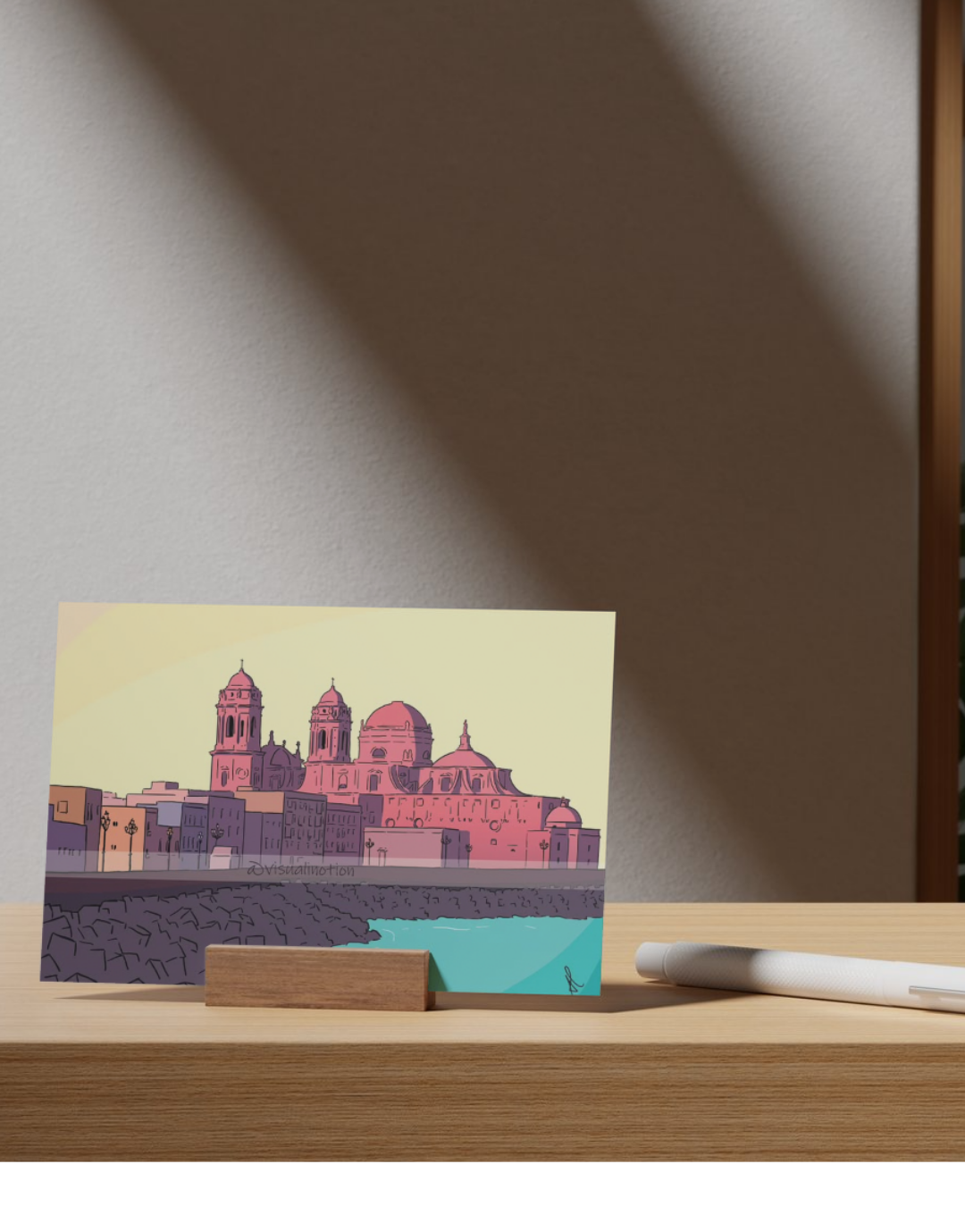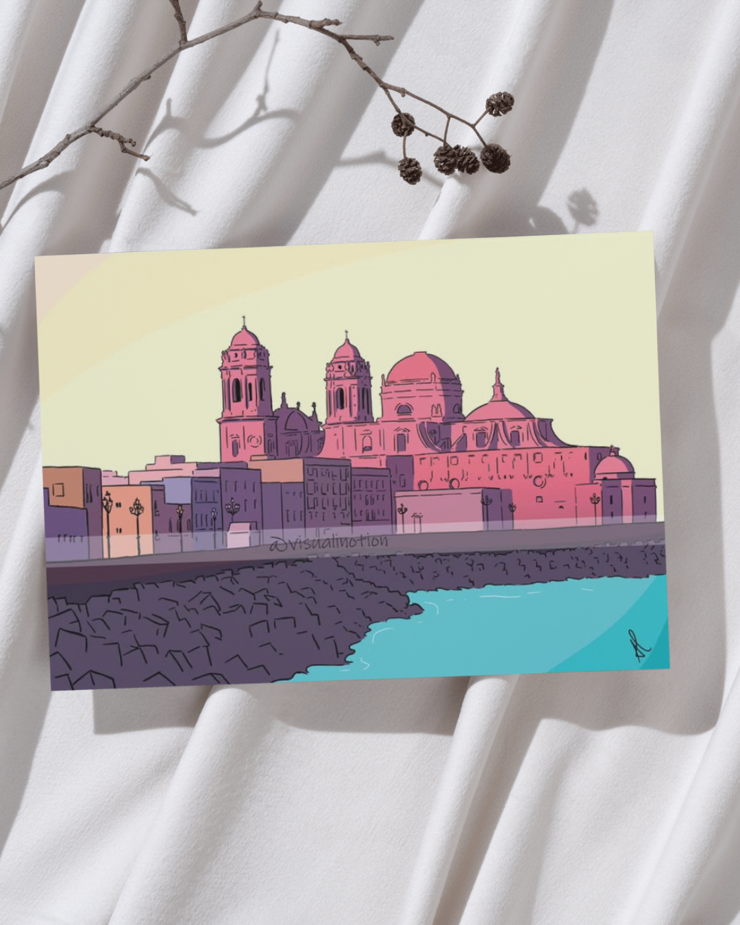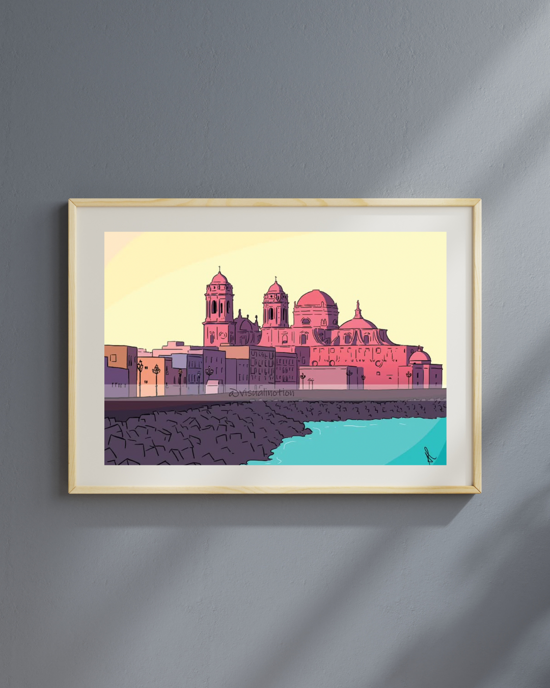 Esta lámina de Cádiz la tienes en varios tamaños, tamañito postal, tamaño a5, A4 o pa ponerlo grande en tu pared en A3.
