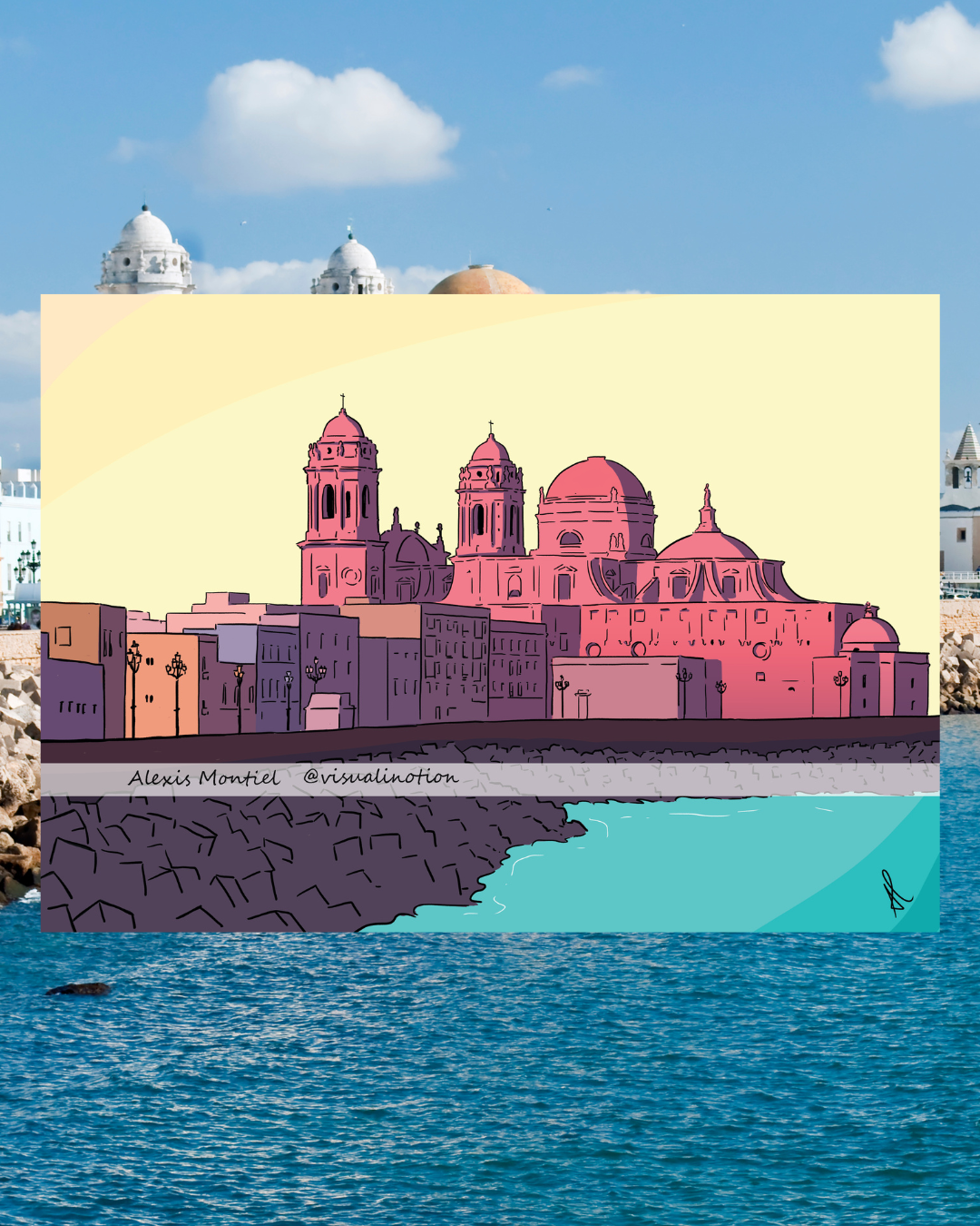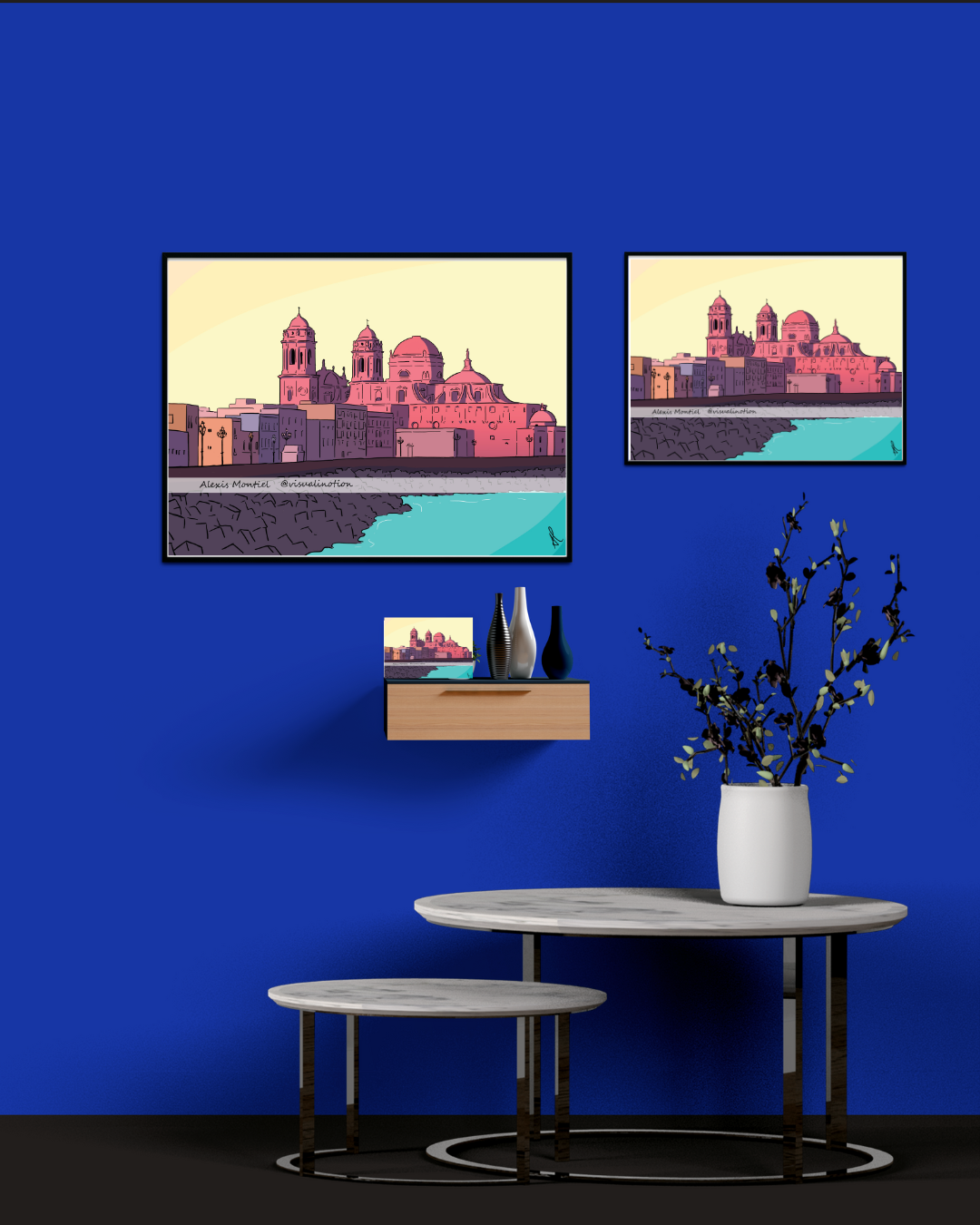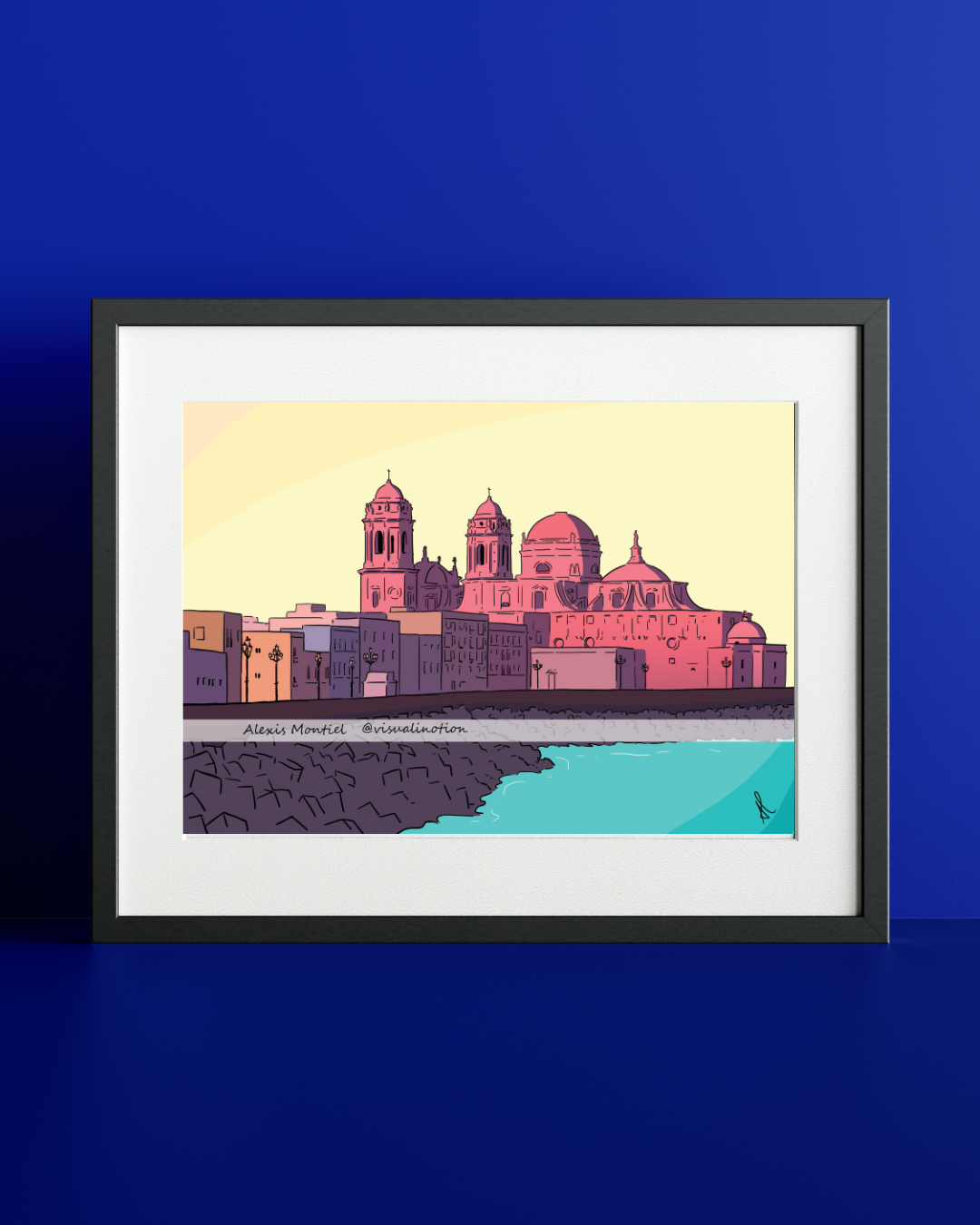 Esta lámina de Cádiz la tienes en varios tamaños, tamañito postal, tamaño a5, A4 o pa ponerlo grande en tu pared en A3.