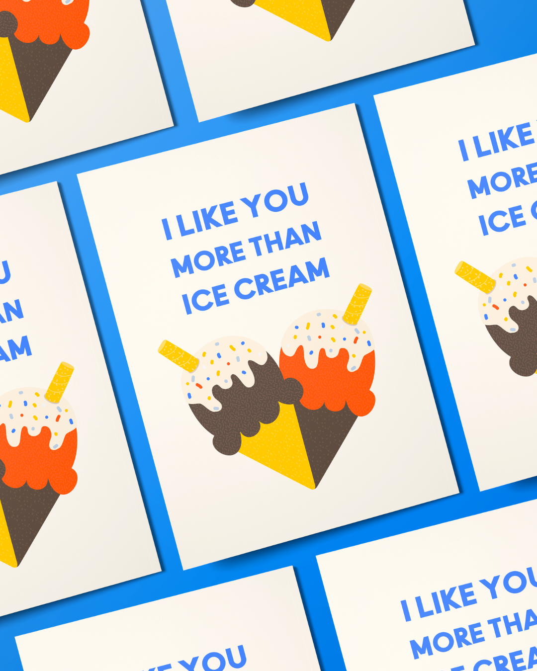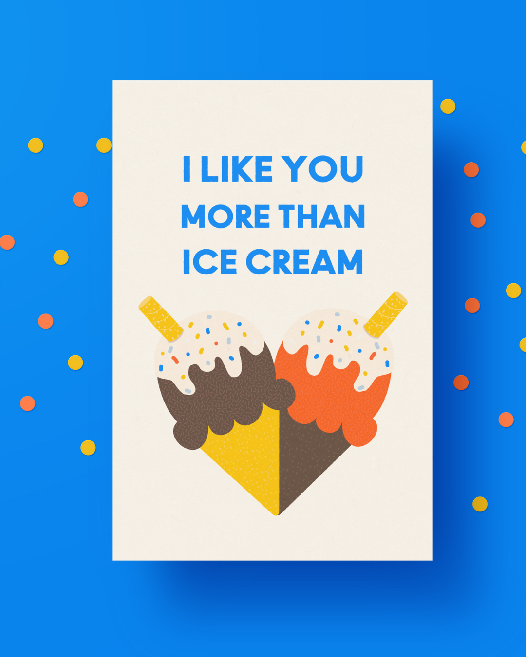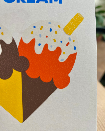 An absolute LOVE STATEMENT in capital letters. Because we love ice cream. So if you give or receive this postcard you have a lot to celebrate. Now you can have ice cream forever, ice cream that doesn't melt.