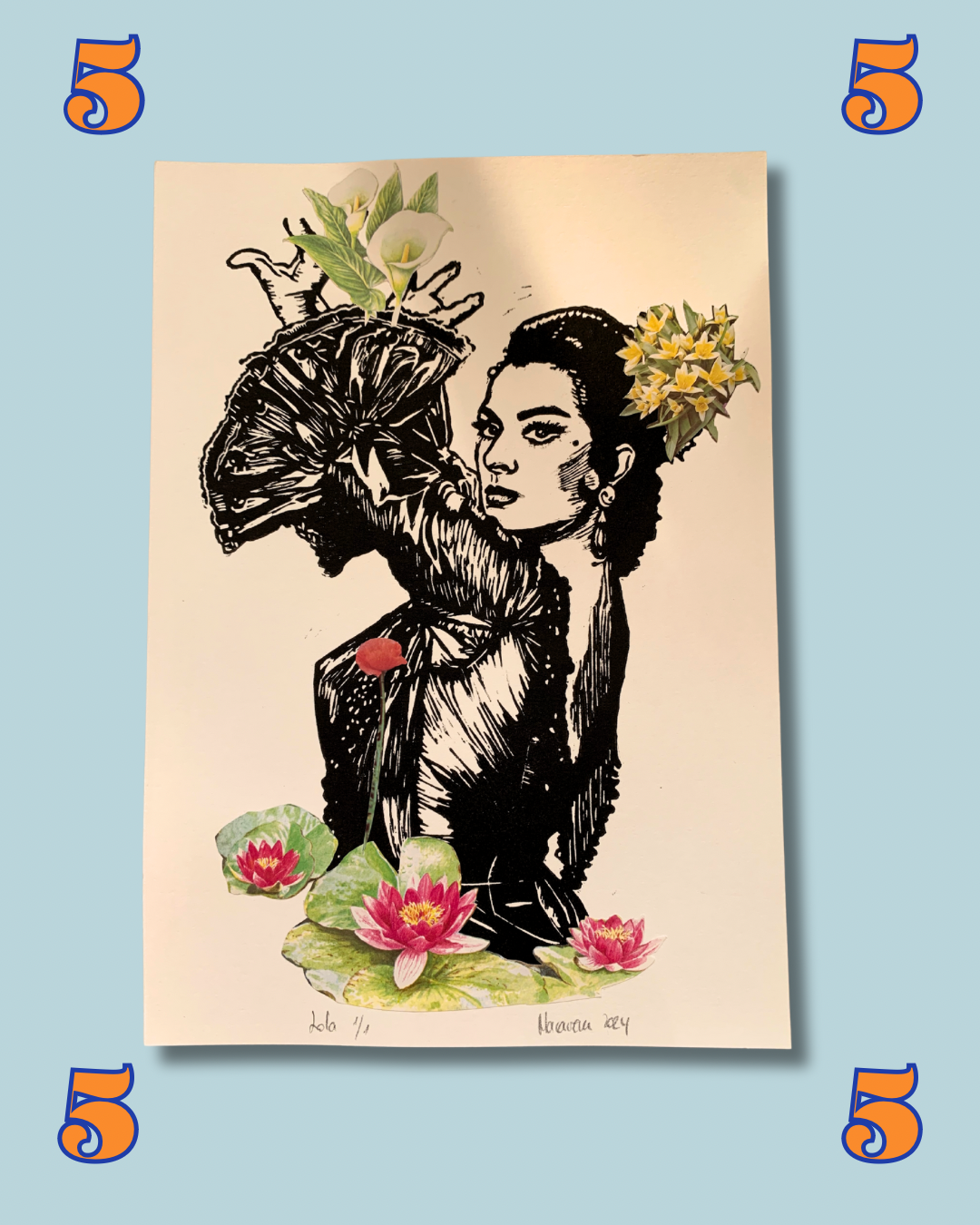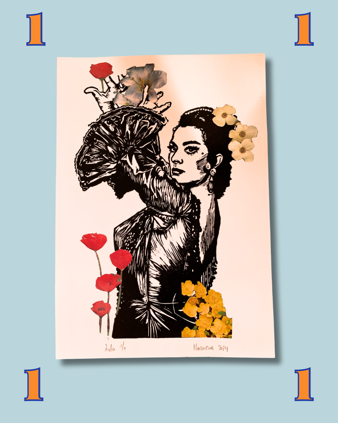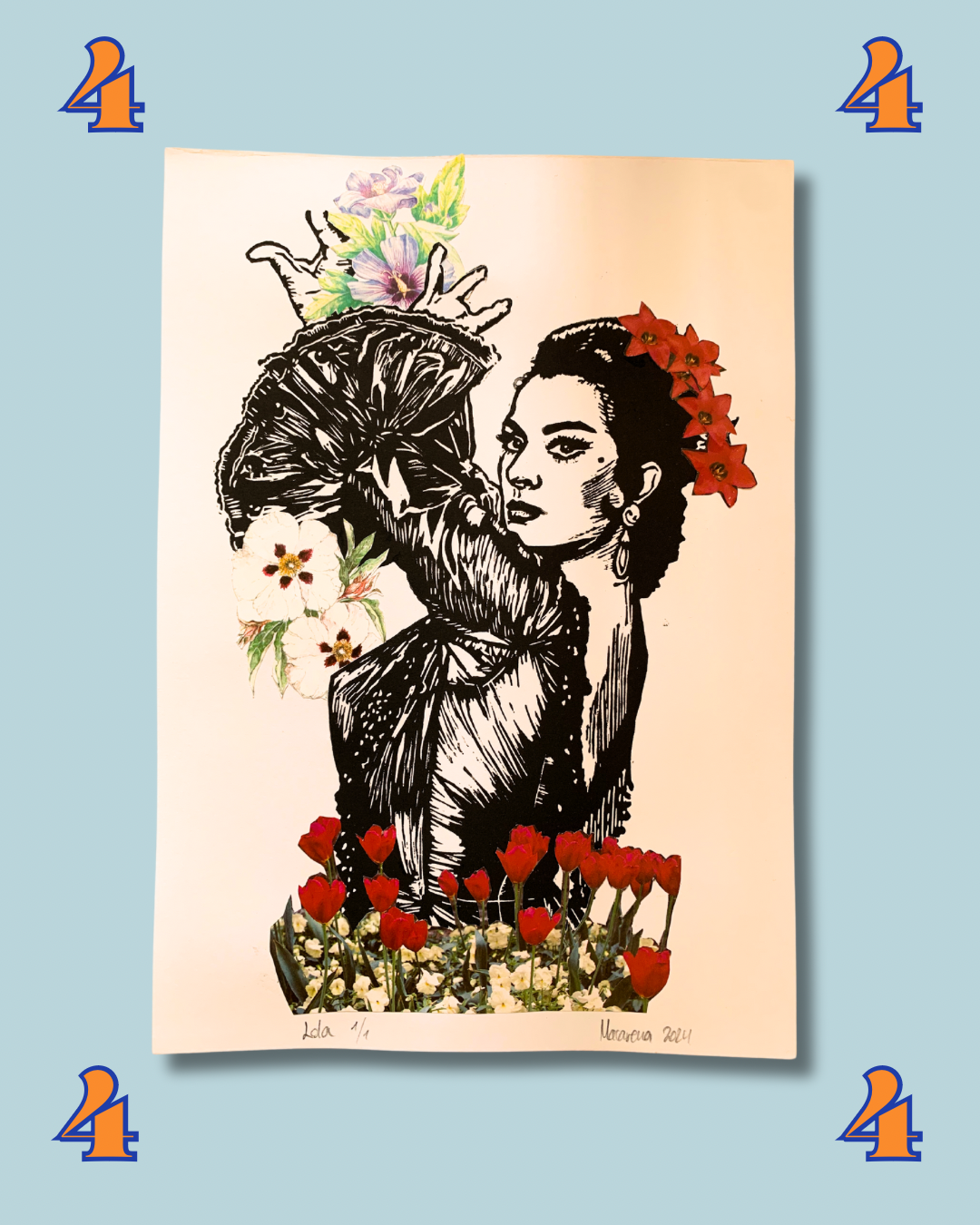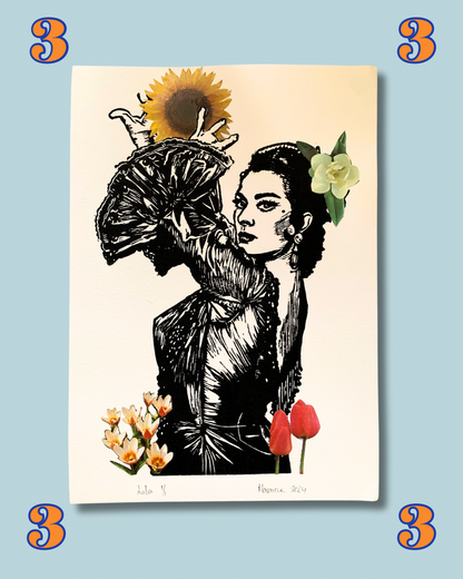 Creada con un linóleo tallado a mano y estampado con una máquina retro… y para hacer honor al nombre de Lola Flores, tiene recortes de flores sacados de revistas para hacerle un collage único.