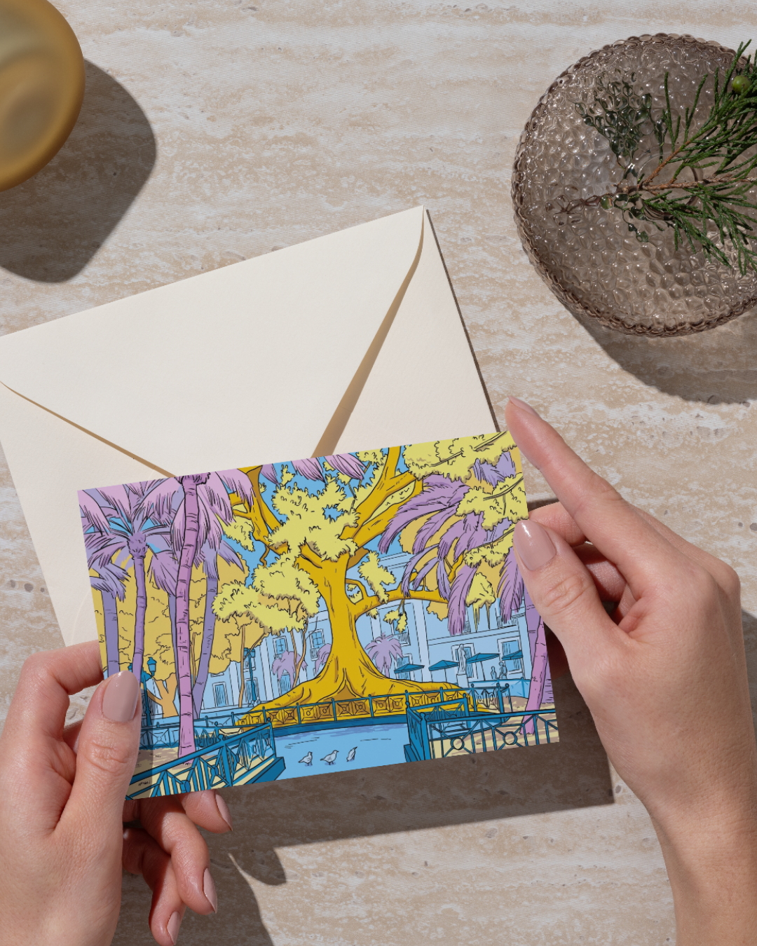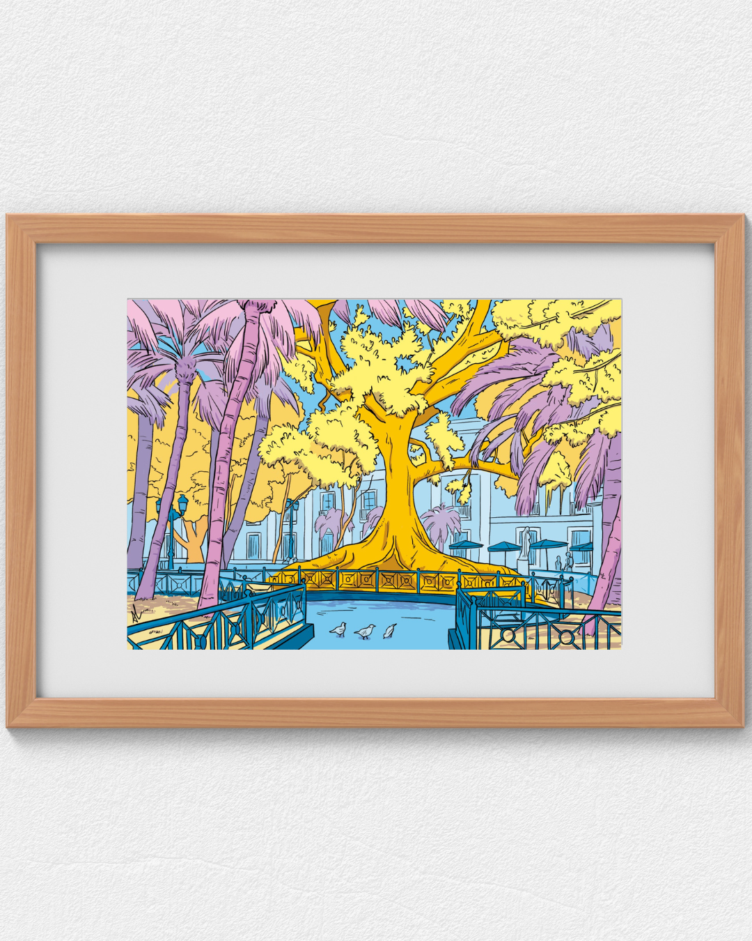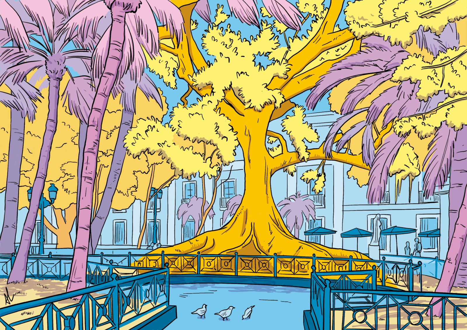 Una ilustración llena de color del corazón verde de Cádiz: la Plaza Mina.