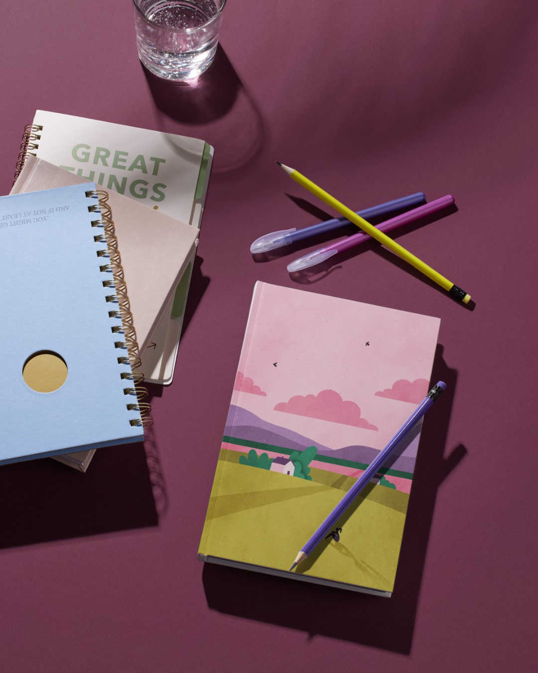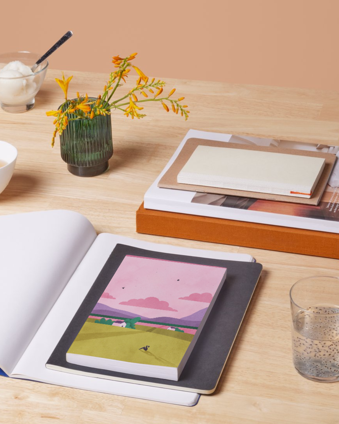 Libretas con ilustraciones de paisajes que inspiran, como este rosa atardecer en un campo verde con su casita y siembra.