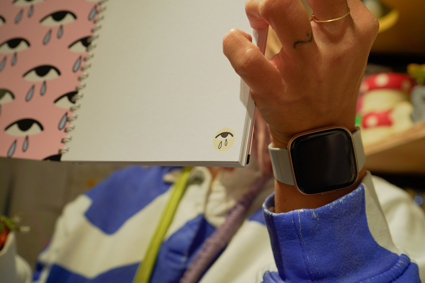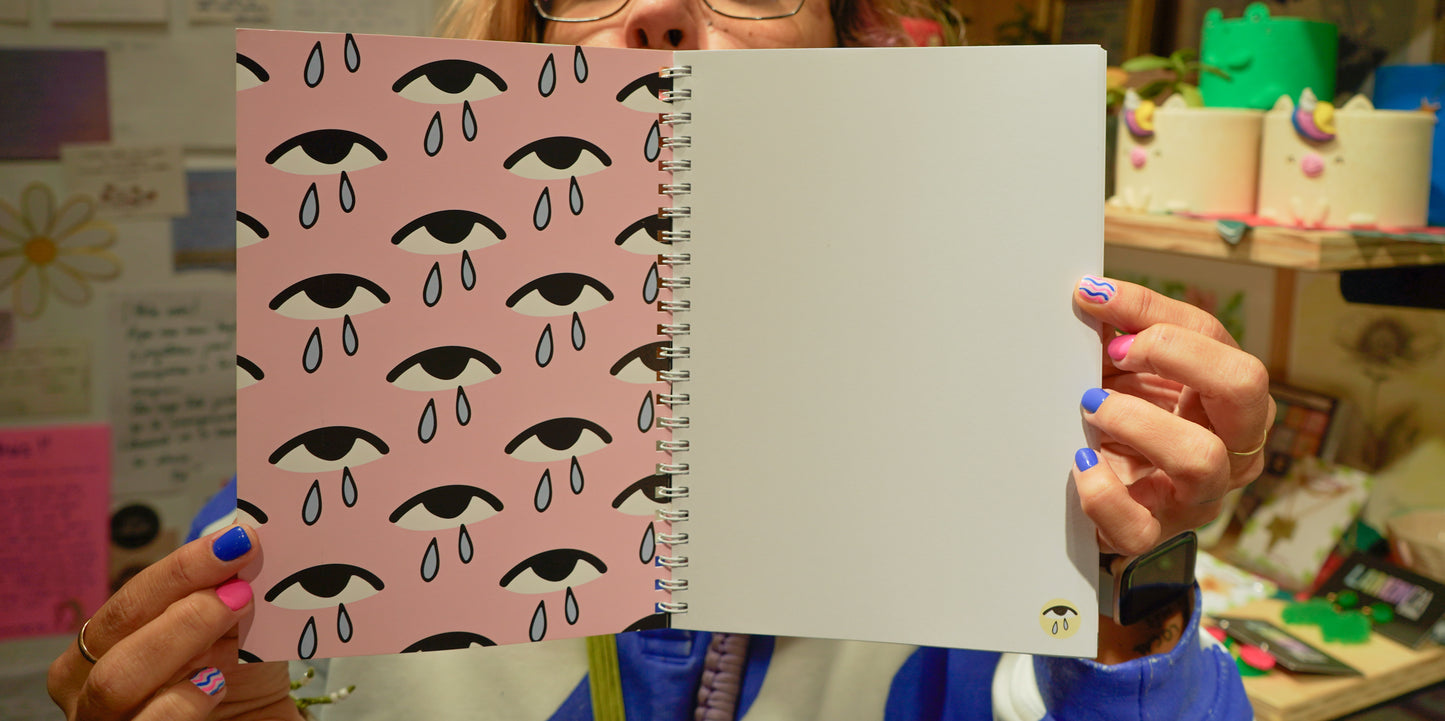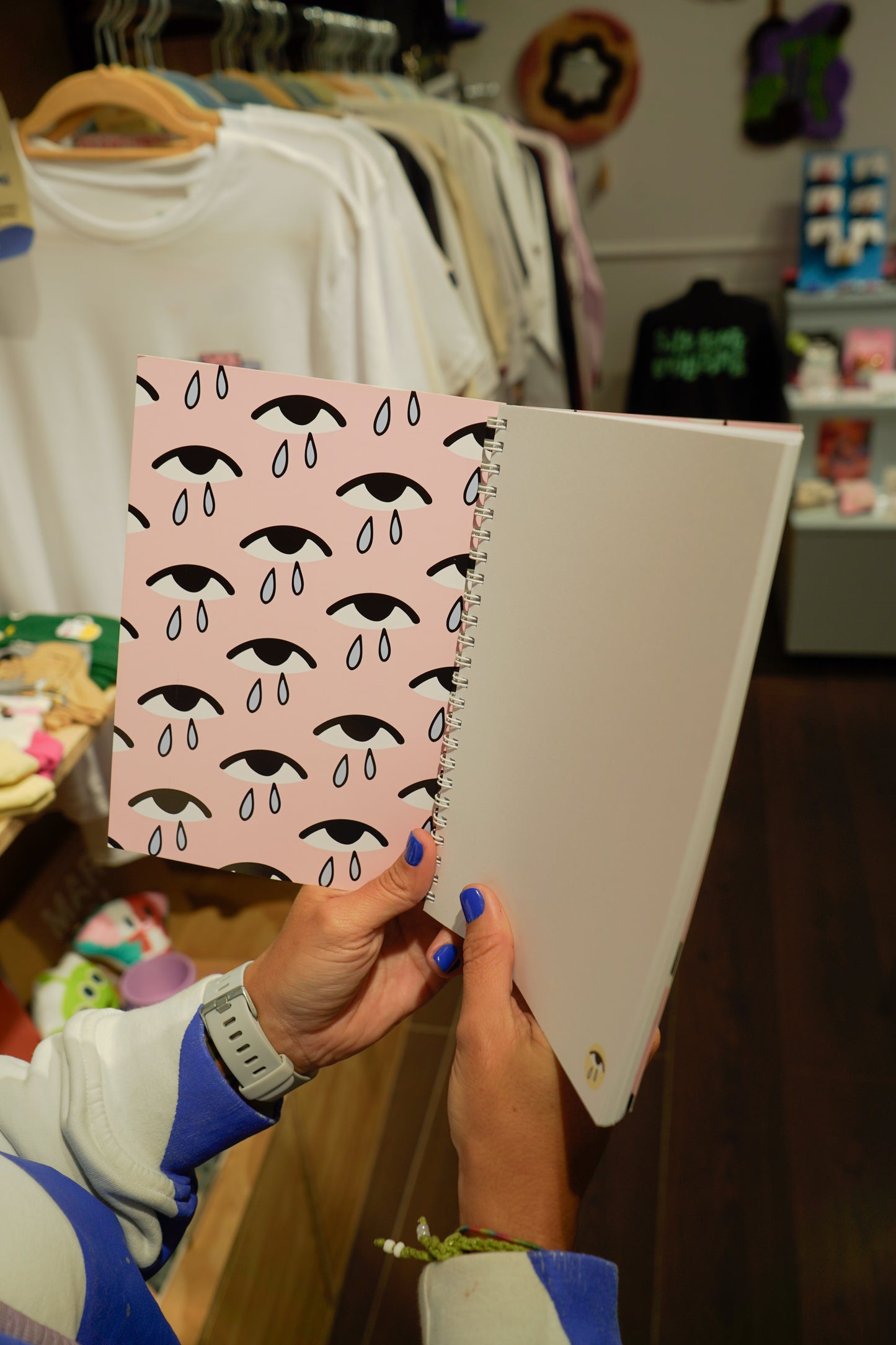 - Libreta de anillas tamaño A5 con ilustraciones por todos lados y pattern dentro, hojas blancas.