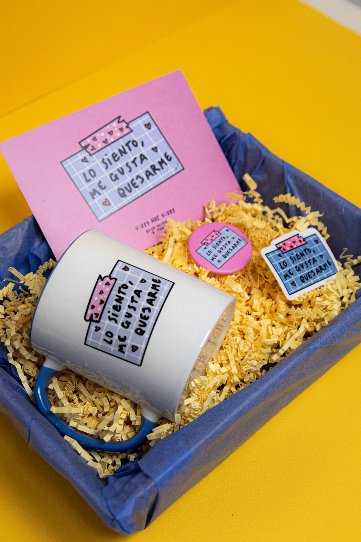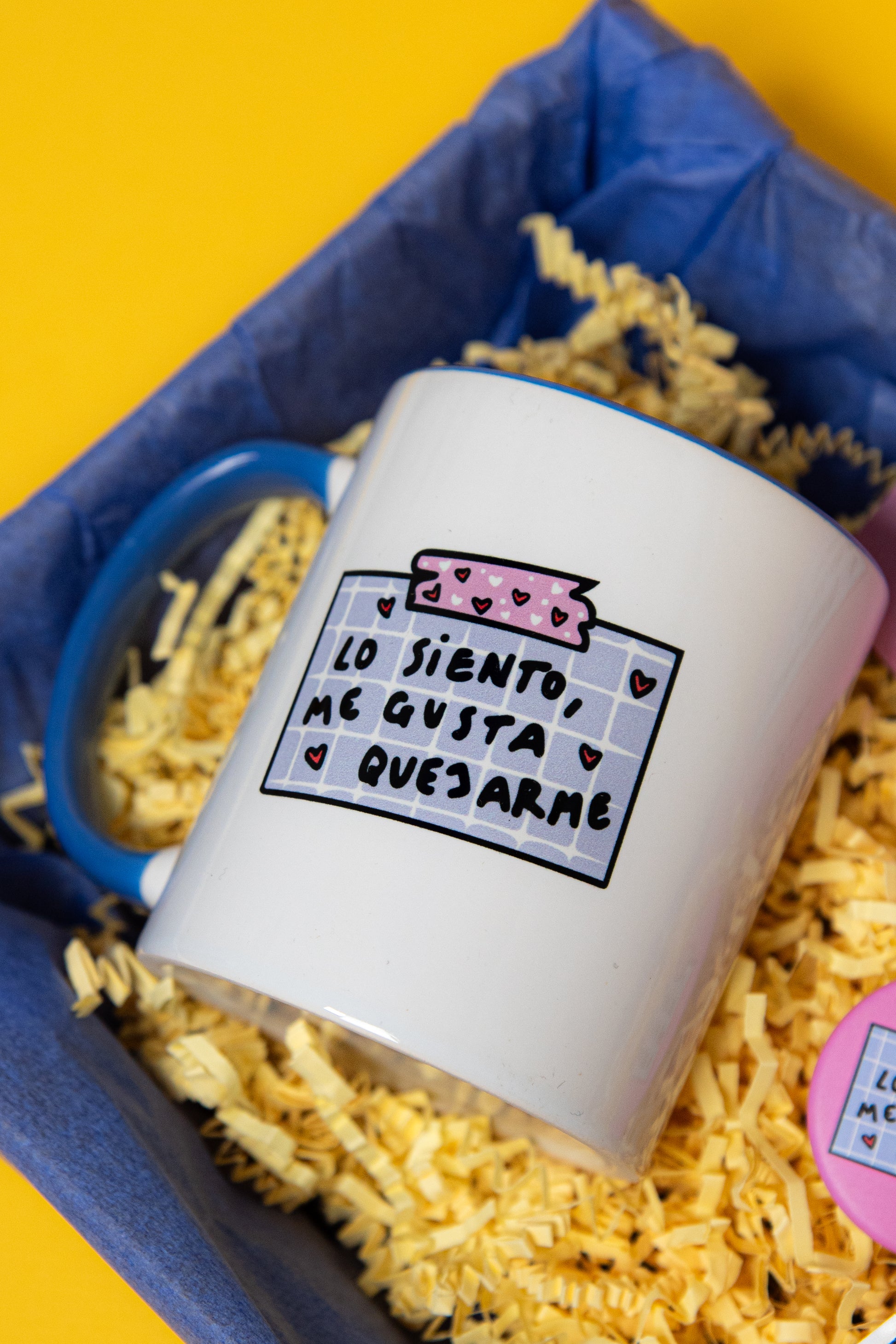 Tiene su buena taza pa quejarse en el desayuno. Su chapa molona pa llevarla por la calle y seguir quejándose. Su pegatina pa poner en el portátil o donde sea y su buena lámina pa ponerla donde quiera.