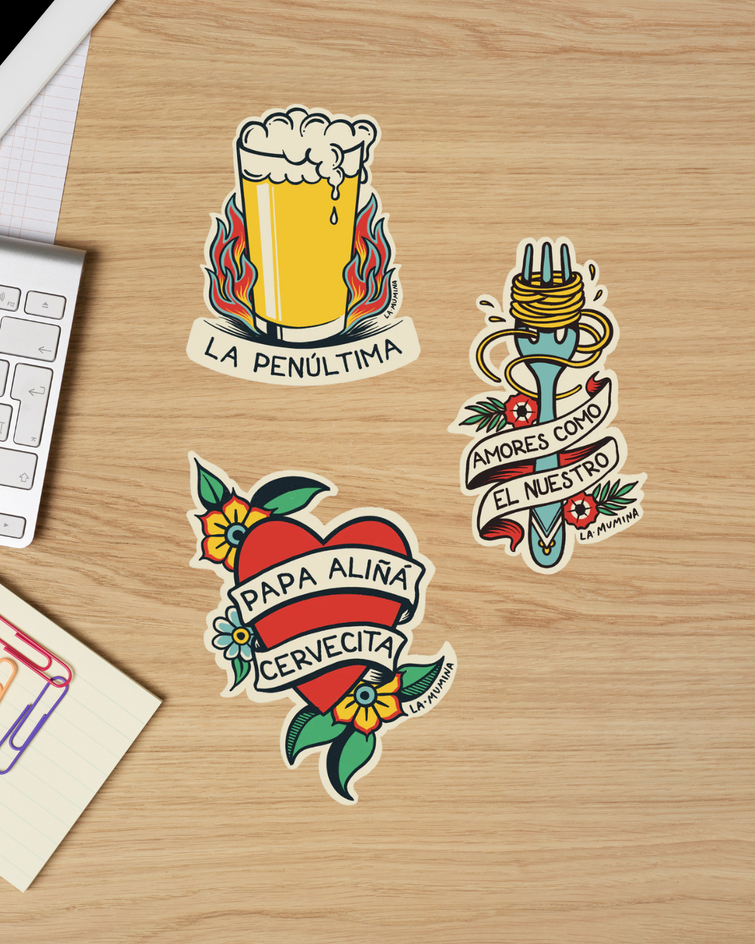 Pegatinas Papa aliñá, La penúltima y Amores como el nuestro