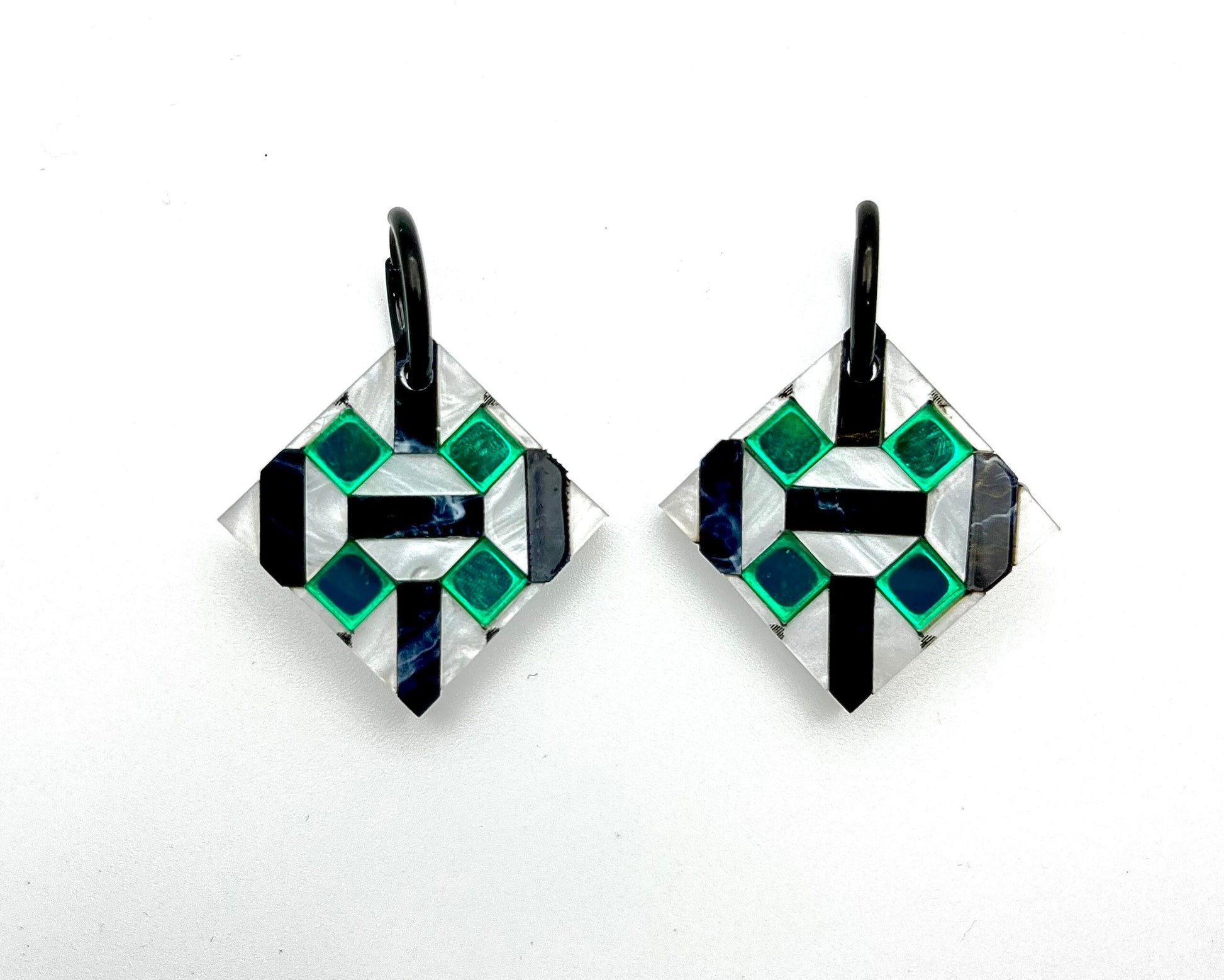 Realizada en metacrilato negro nacarado, blanco perlado y verde.