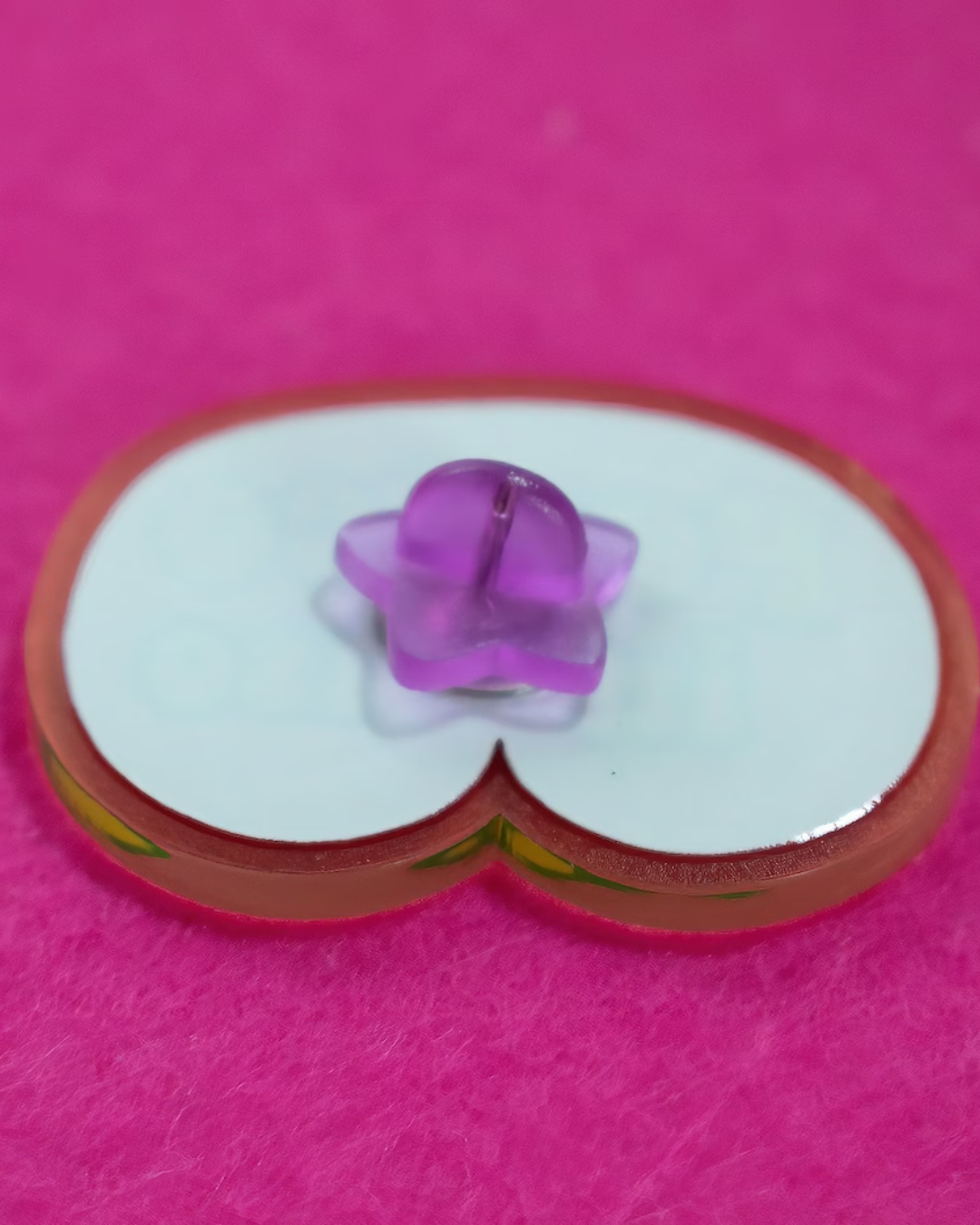 - 👉 Pin acrílico de 4 cm. aprox, con cierre de goma de colores con formas de corazón o estrella.