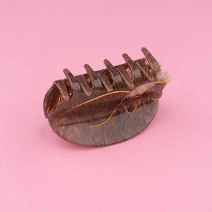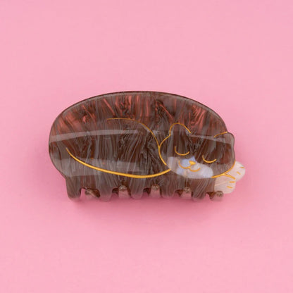 Esta gran pinza de gato marroncito ronronea en tu pelo y lo aguanta perfecto todo el día!