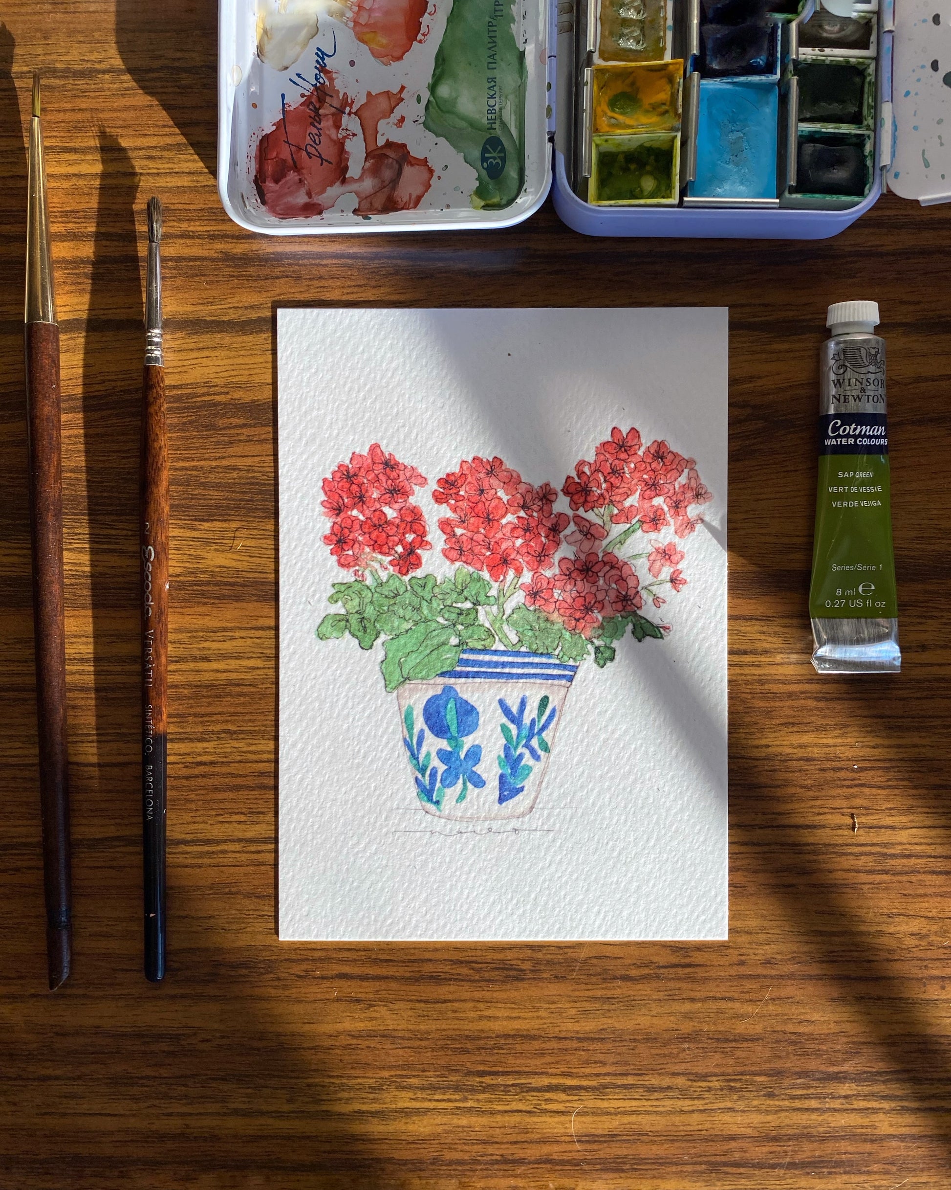 Esta postalita tamaño a5 de una maceta tipo granaina y con geranios es más bonita que qué.