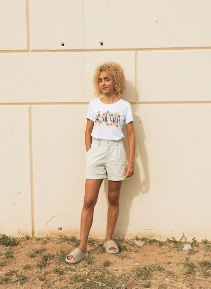 Esta camiseta florece y te recuerda pues que tenemos que cuidarnos, protegernos y dedicarnos ratito pa nosotras.