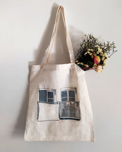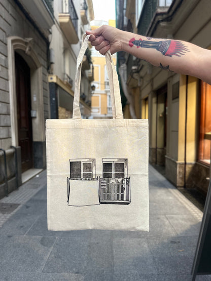Esta totebag de balcón andalú está estampao en sevilla y es de algodón orgánico.